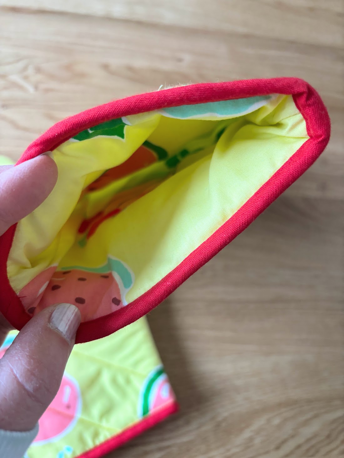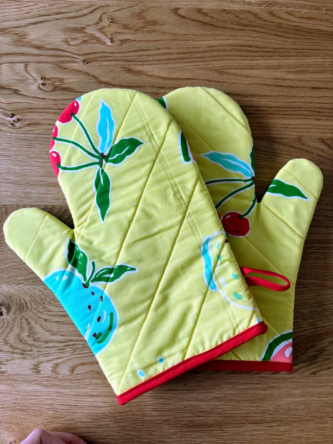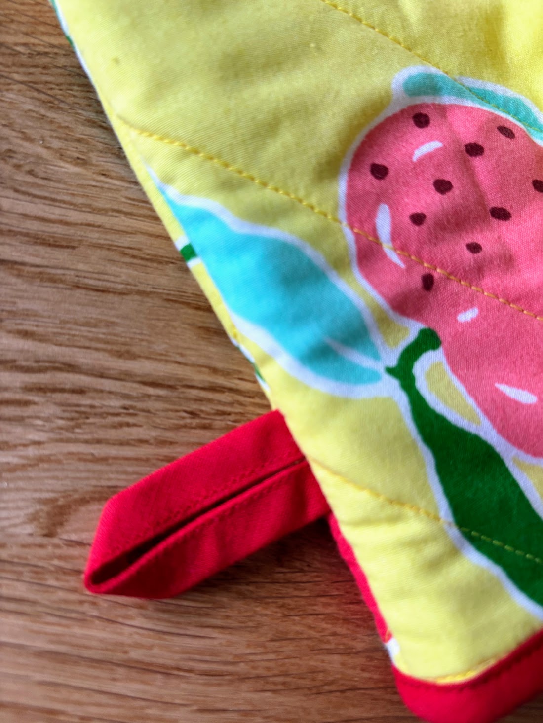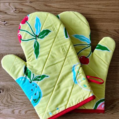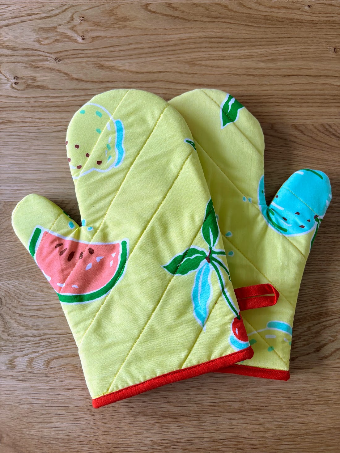 Ajoutez une touche de fraîcheur et de gaieté à votre cuisine avec nos maniques gants cousues main dans un tissu jaune lumineux décoré de fruits colorés.