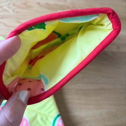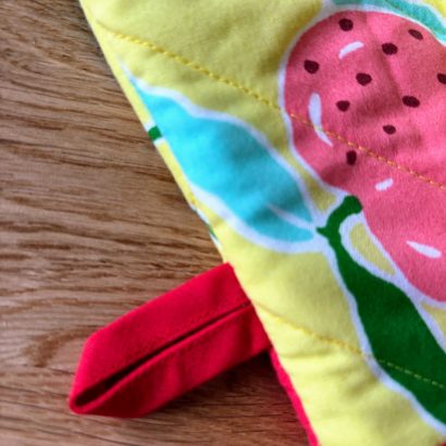 - Tissu extérieur 100 % coton motif fruits (des deux côtés) et biais rouge
