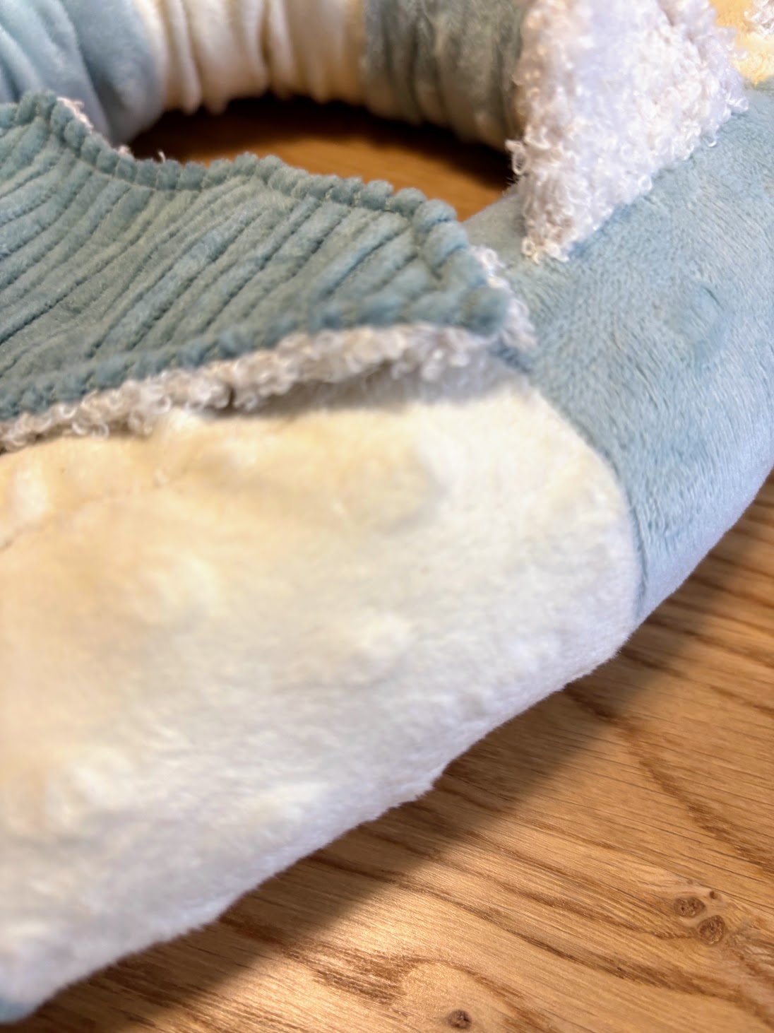 🧵 Fait main avec amour, dans des matières soigneusement choisies, pour offrir douceur, sécurité et beaucoup de tendresse. Tissus Oeko tex. Velours couleur aqua, miniky couleur aqua et jaune très pâle. Bouclette blanc cassé.