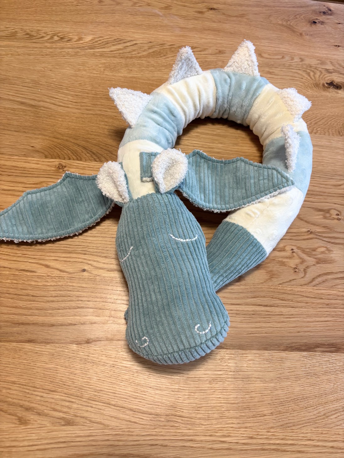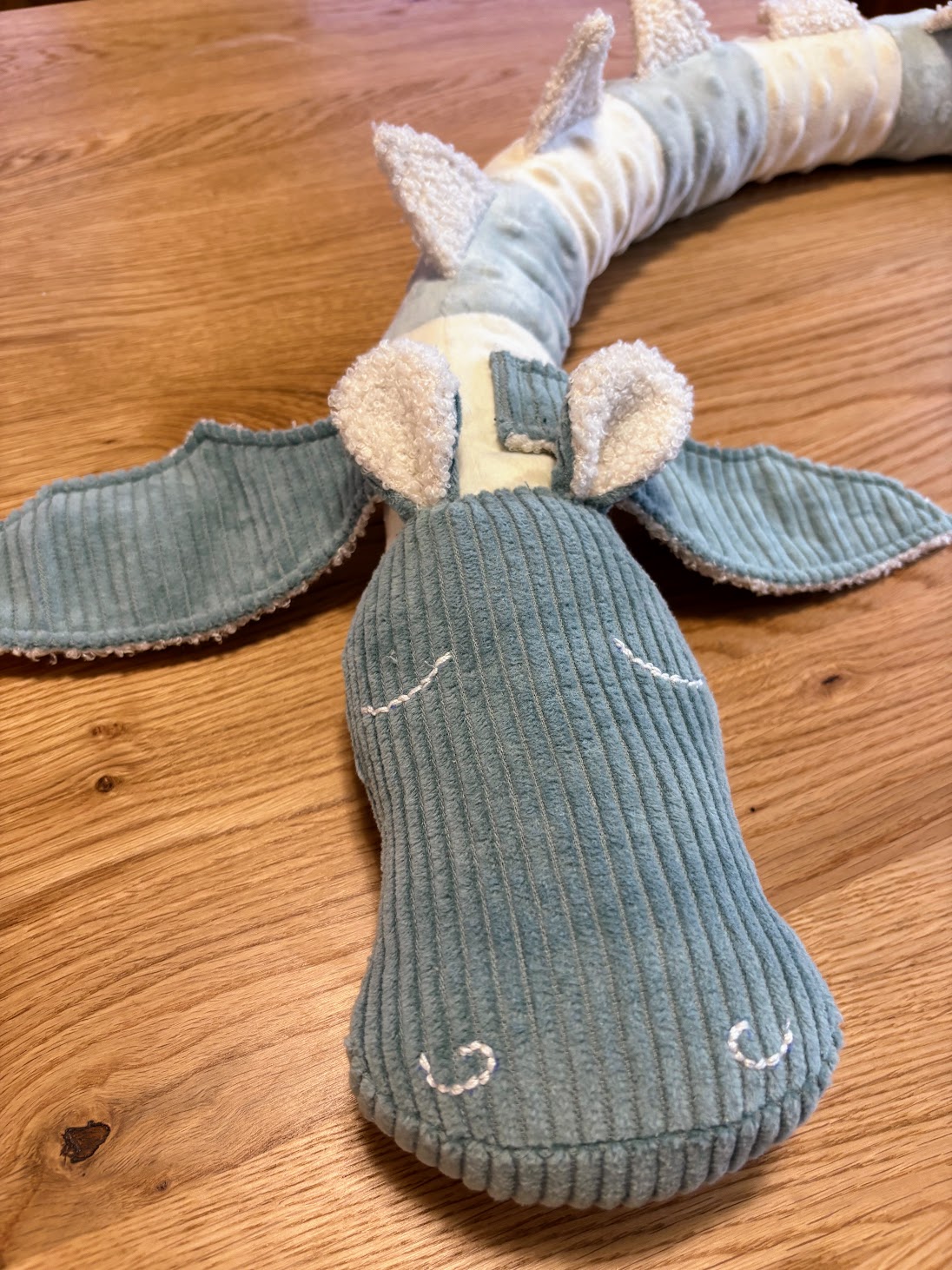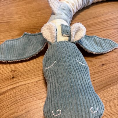 Avec son long corps souple, ses petites ailes tendres et ses détails délicatement brodés, ce dragon devient tour à tour compagnon de jeu, coussin géant, doudou protecteur ou gardien des rêves. Sa taille généreuse permet aux enfants de l’enlacer, de s’y blottir ou de l’emmener dans leurs histoires les plus fantastiques.