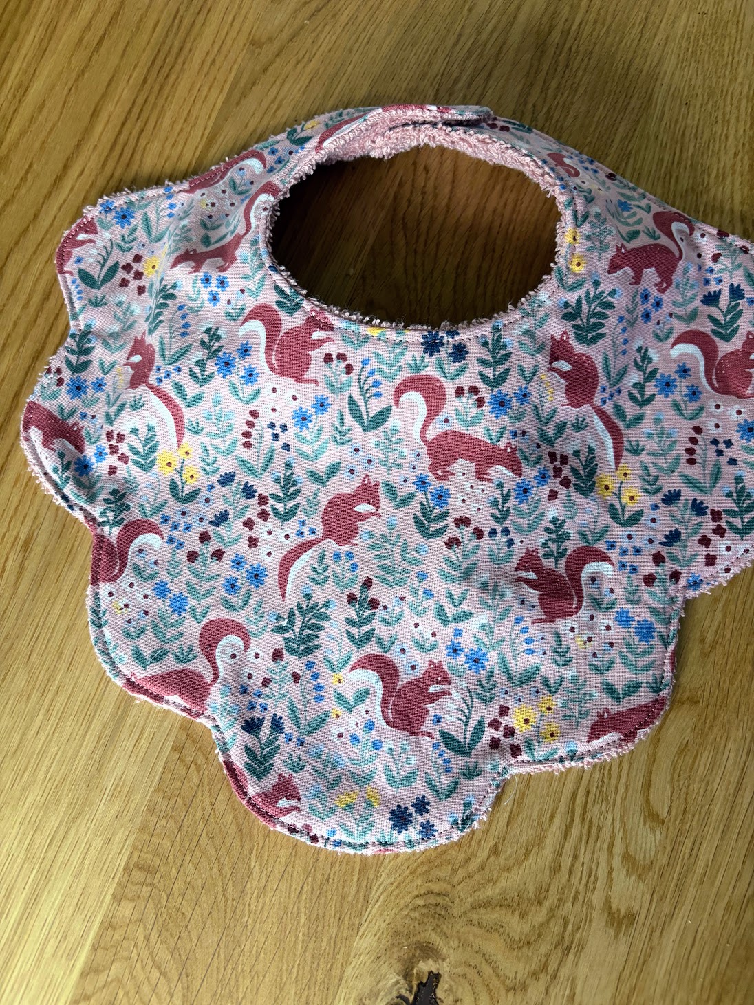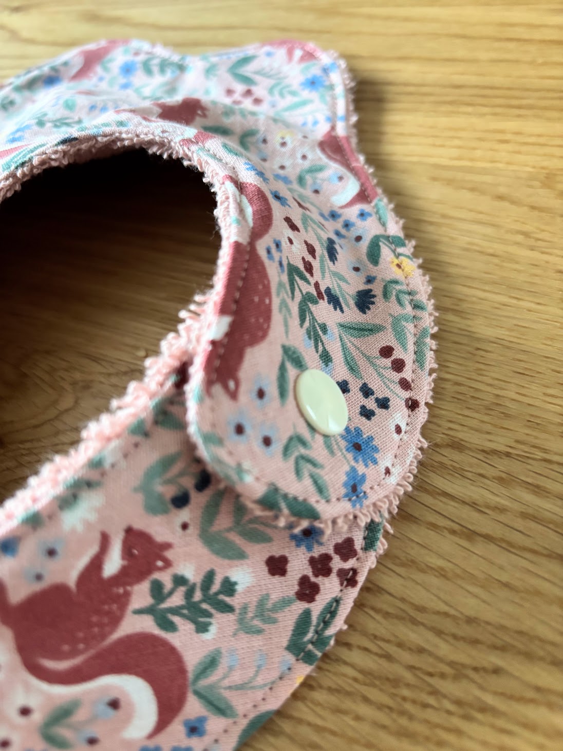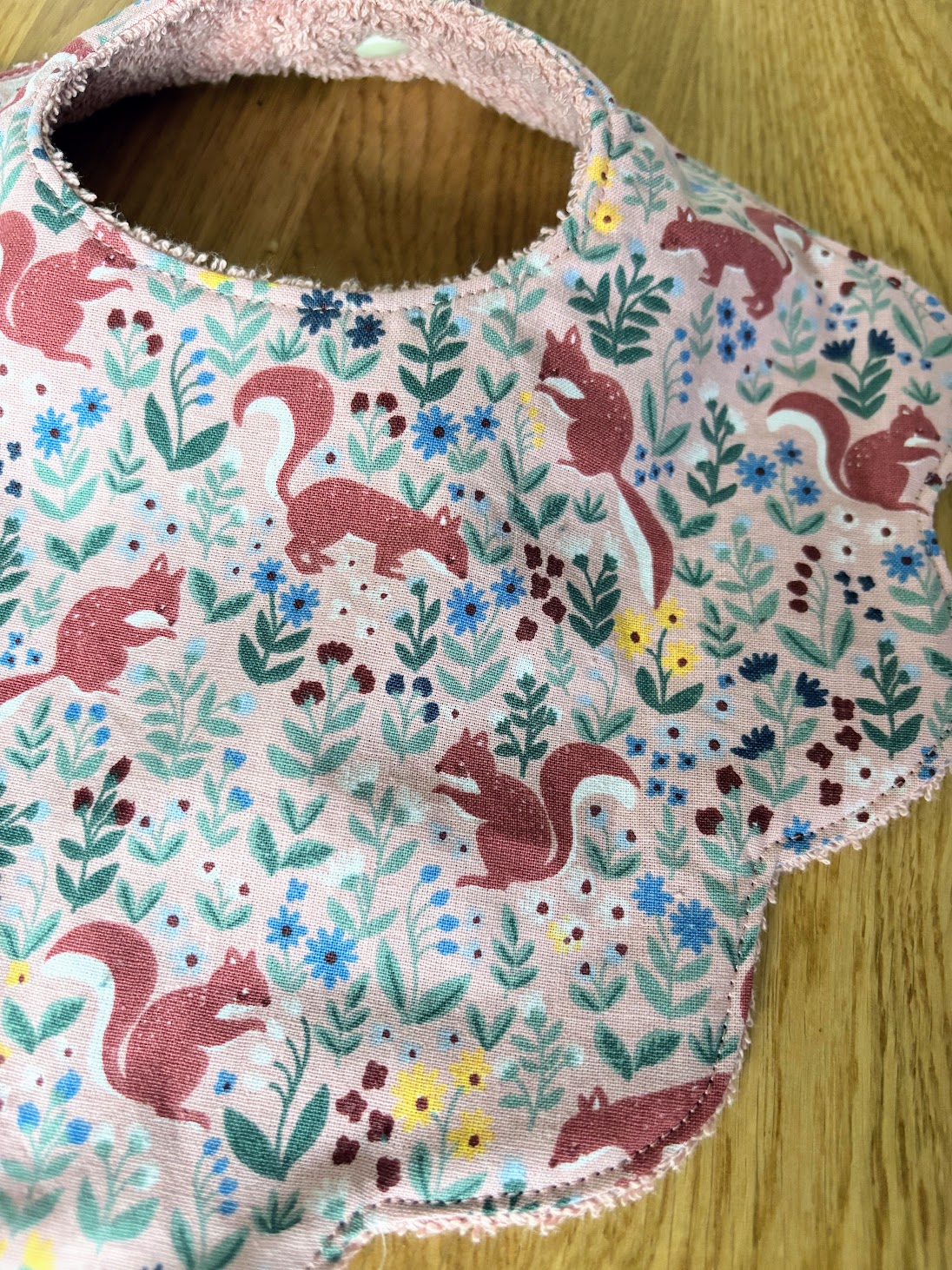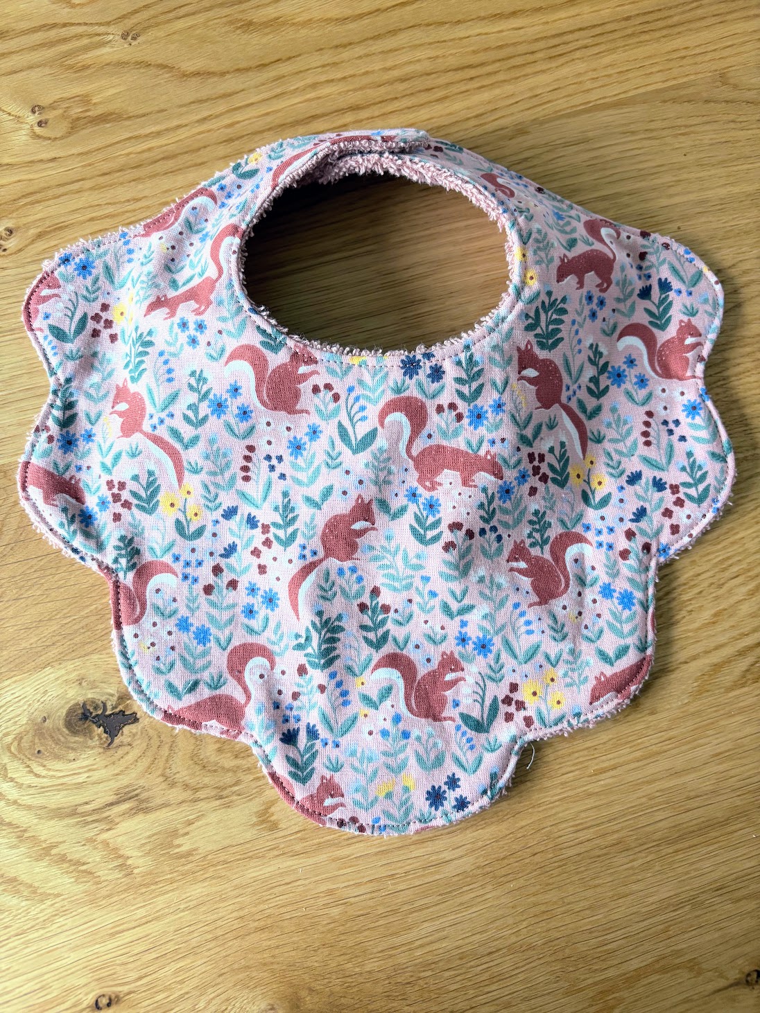 Son imprimé délicat met en scène de petits écureuils nichés au cœur d’une végétation fine et colorée, sur un fond rose tendre qui respire la douceur.