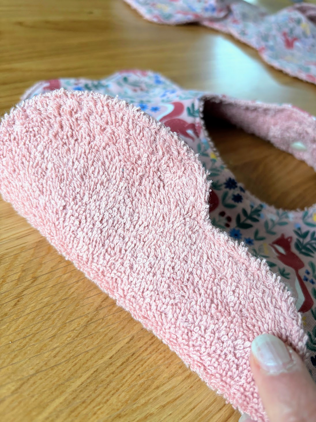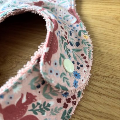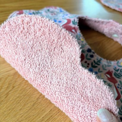 À l’intérieur, une éponge de coton vieux rose, douce et absorbante, protège efficacement les vêtements tout en respectant la peau sensible de bébé.