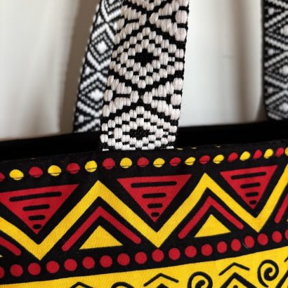 Les sangles ethniques en coton noir et blanc assurent une bonne tenue à l’épaule tout en renforçant l’identité graphique du sac.