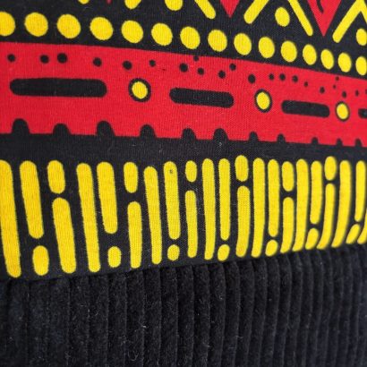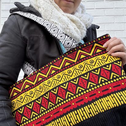 Le contraste entre le wax en coton aux motifs graphiques et colorés et le velours côtelé noir apporte du caractère et de l’élégance à ce cabas hors du commun. L’intérieur, entièrement noir, reste sobre et pratique, et une petite poche intérieure permet de garder clés ou téléphone à portée de main.
