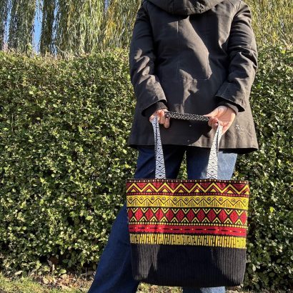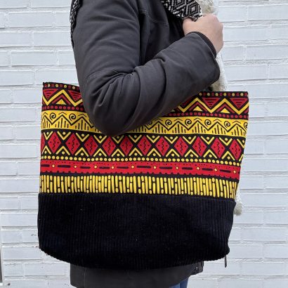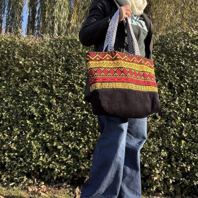 Pensé pour celles et ceux qui aiment tout emporter avec eux, ce grand cabas en wax et velours côtelé noir est idéal pour partir au marché, faire des courses ou accompagner les journées bien remplies. Son format généreux permet de transporter facilement fruits, légumes, livres ou essentiels du quotidien.