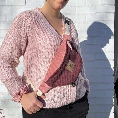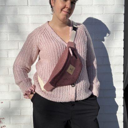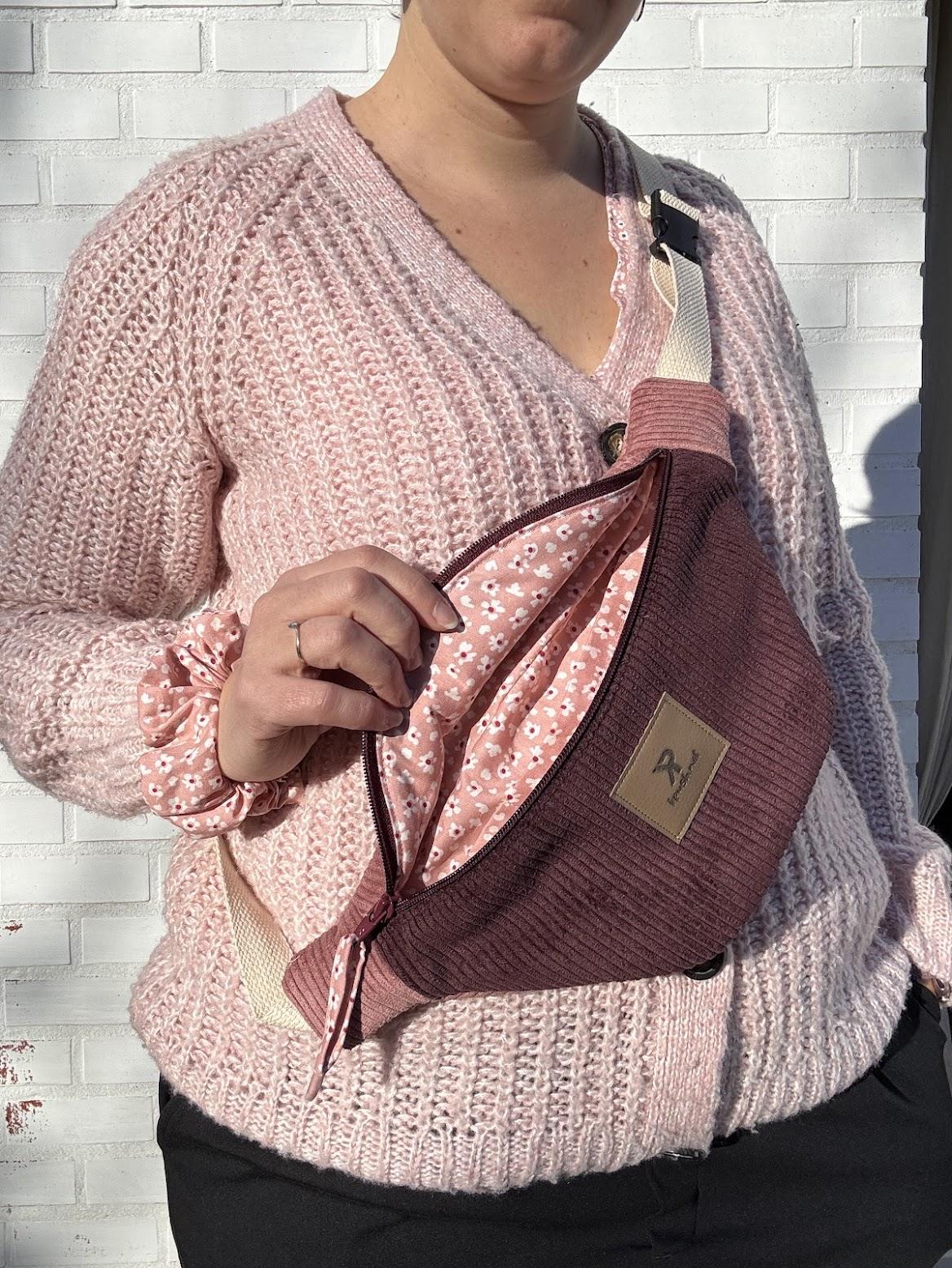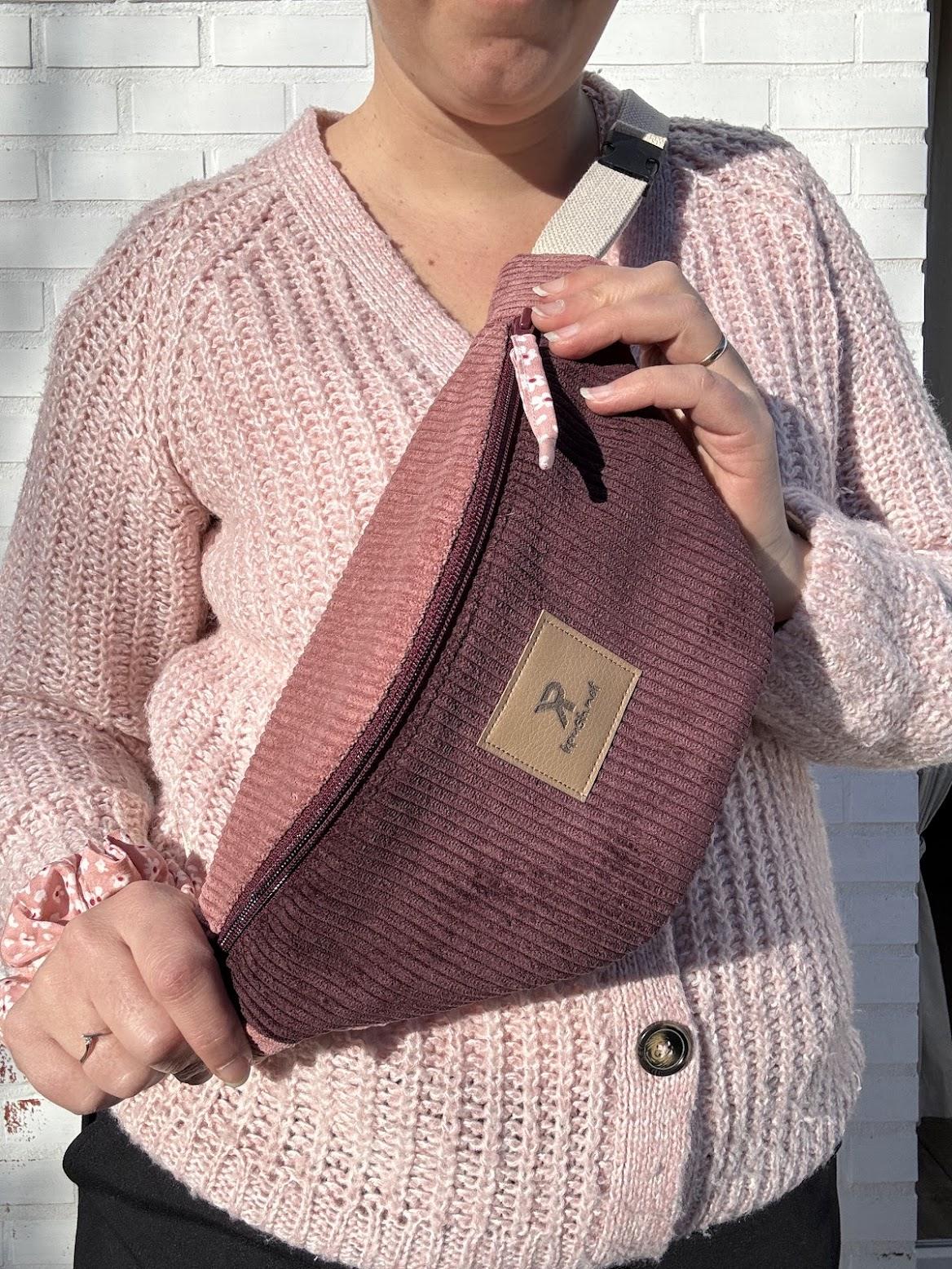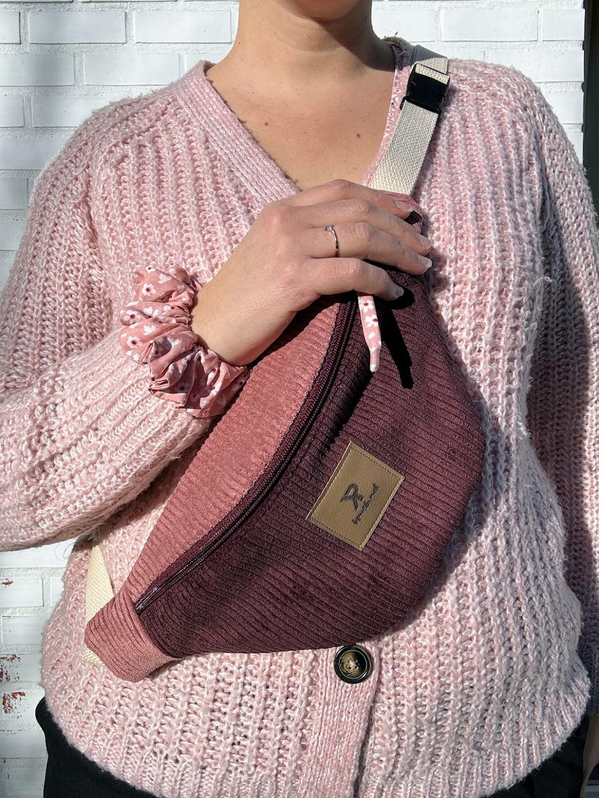 Confectionnée en velours côtelé bicolore — un prune profond associé à un vieux rose tout doux — elle joue sur les contrastes avec élégance.