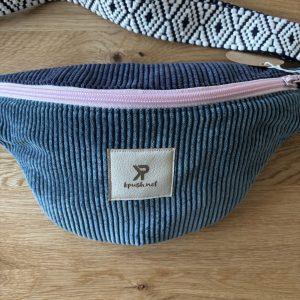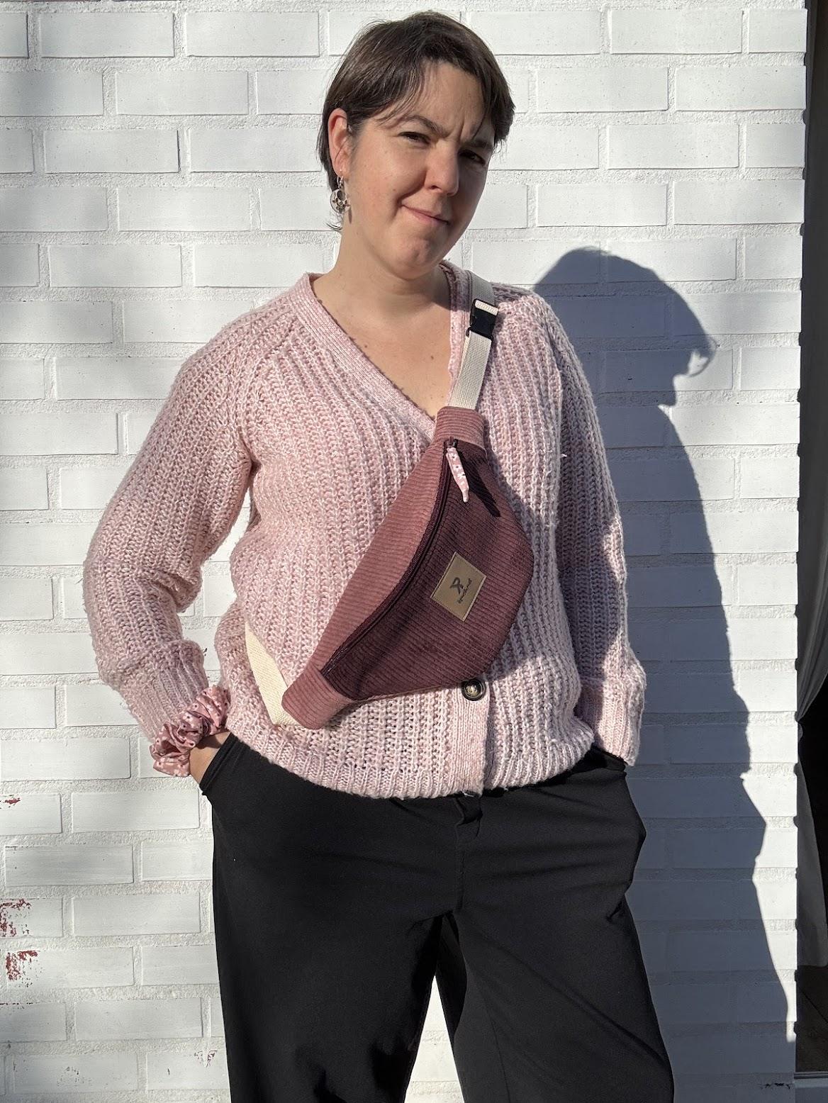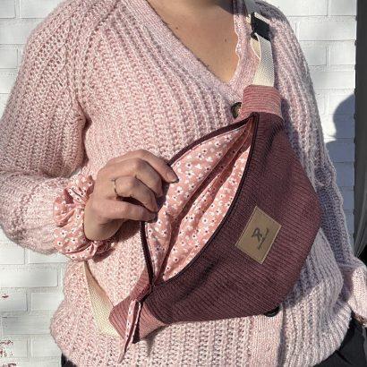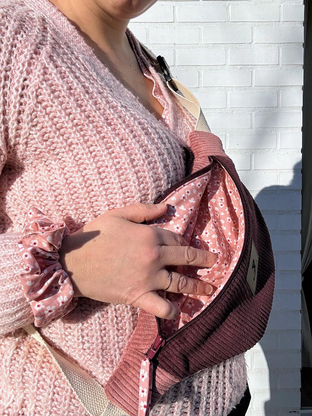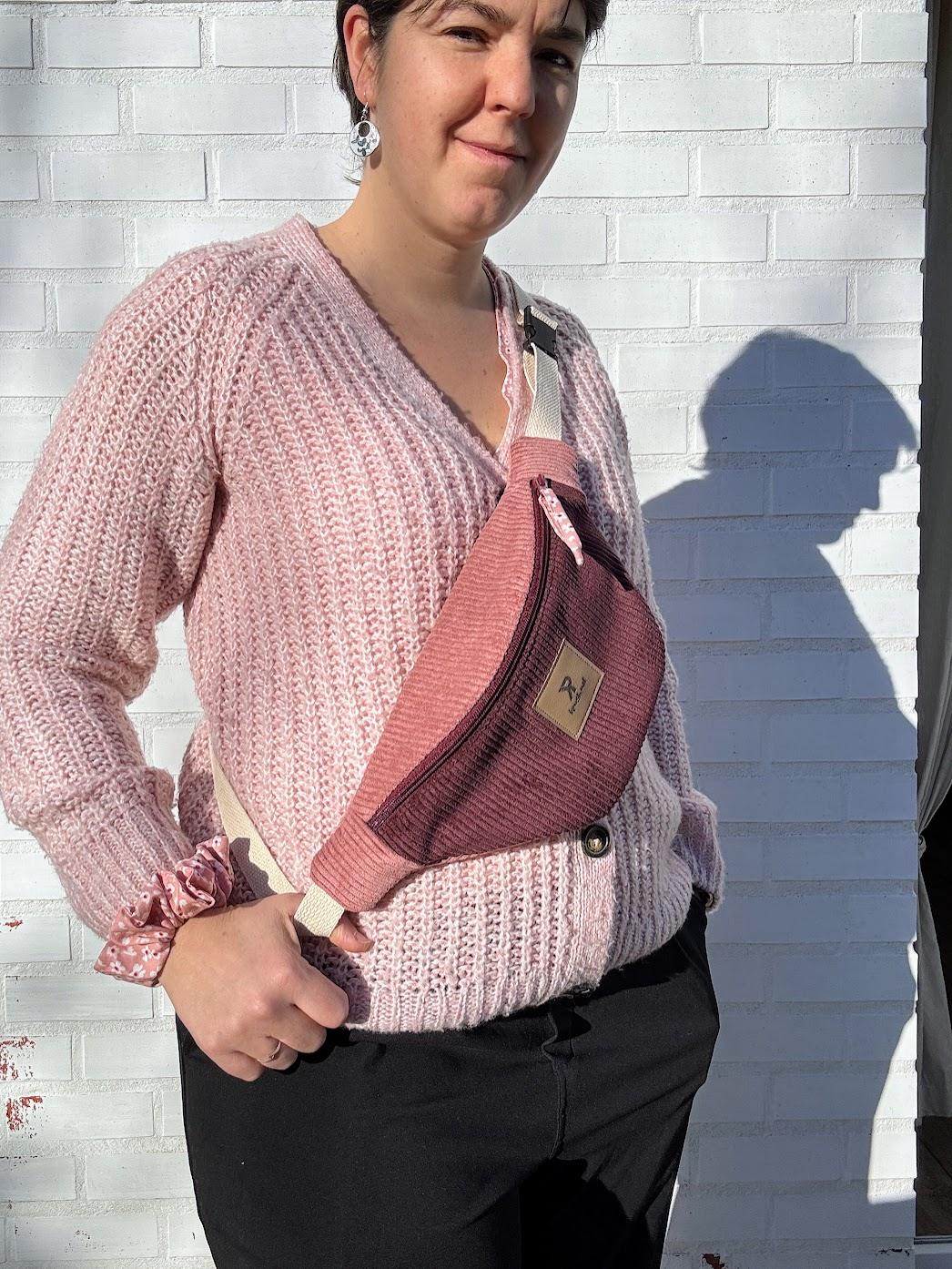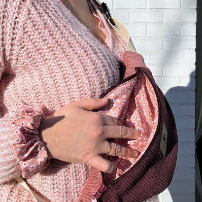 Confectionnée en velours côtelé bicolore — un prune profond associé à un vieux rose tout doux — elle joue sur les contrastes avec élégance.