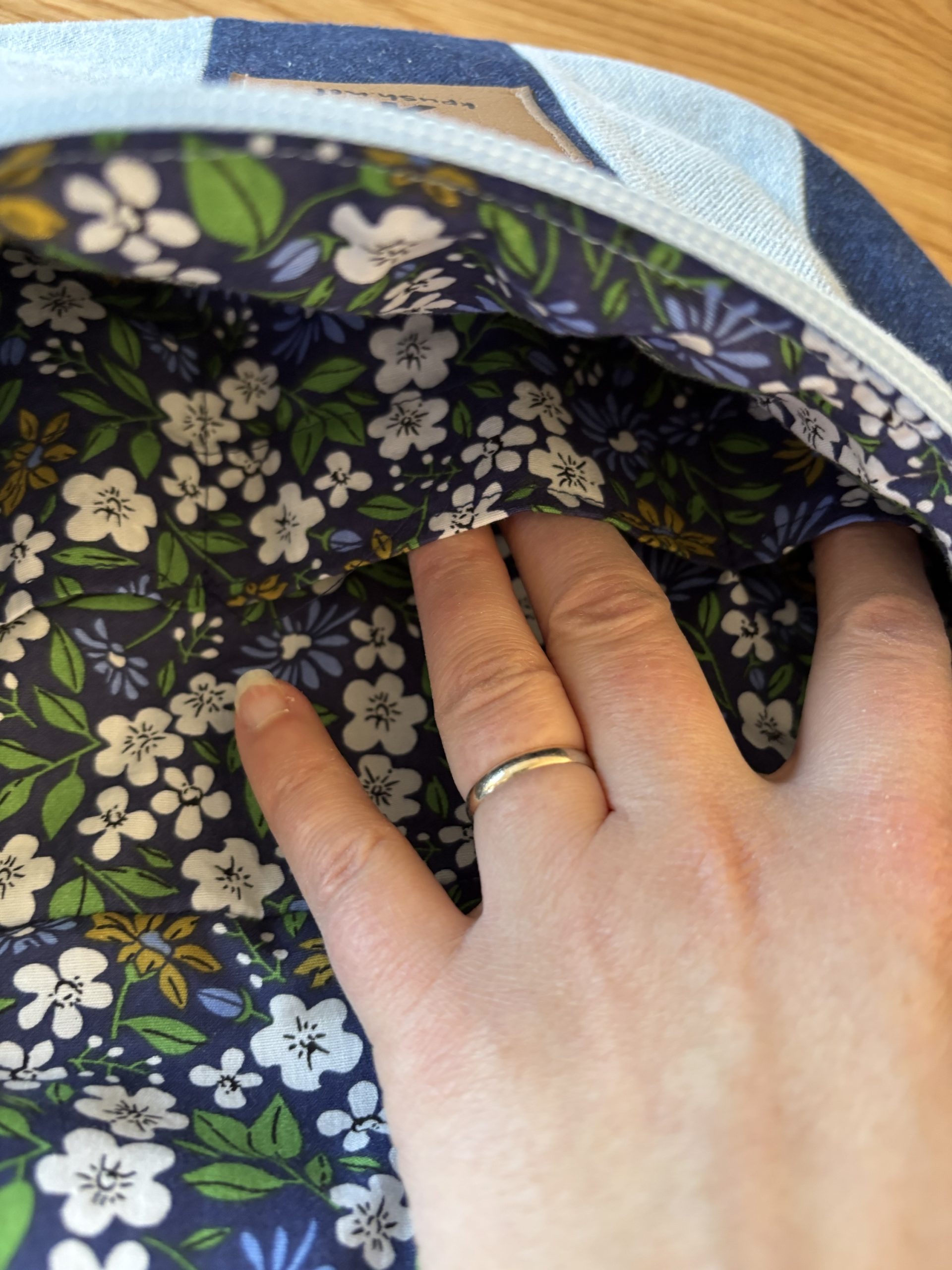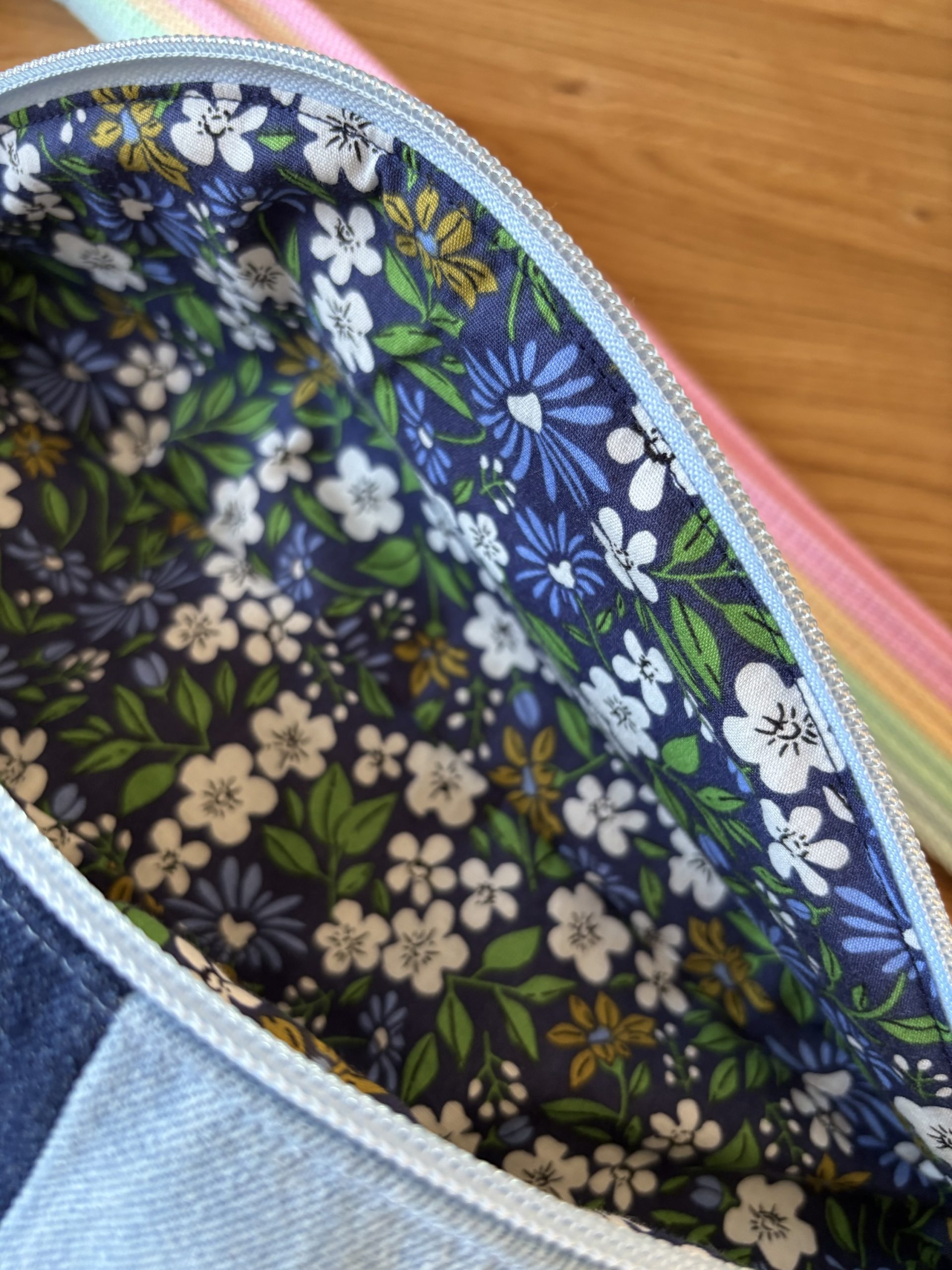 Son patchwork de jeans 100 % coton lui donne du caractère, tandis que la sangle arc-en-ciel apporte une touche joyeuse et assumée. À l’intérieur, une doublure fleurie dans les tons verts et bleus ajoute une note colorée.