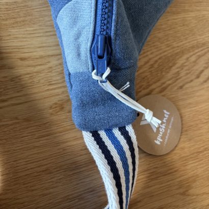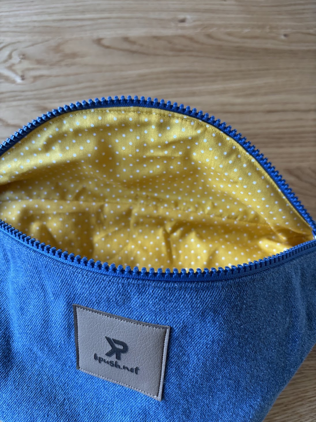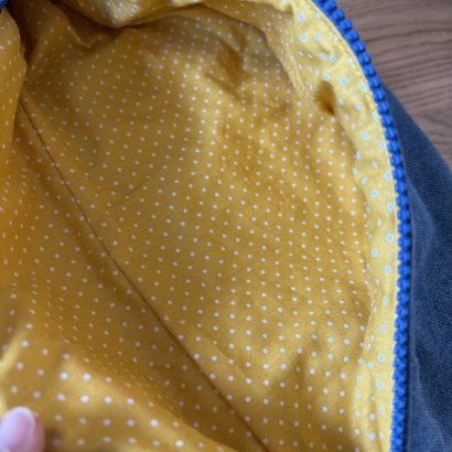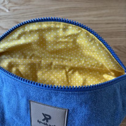 Réalisée à partir de jeans 100 % coton, elle est triplée pour une belle tenue et une bonne durabilité. À l’intérieur, une doublure jaune à petits pois apporte une touche joyeuse et lumineuse, discrète à l’extérieur mais pleine de caractère à l’ouverture.