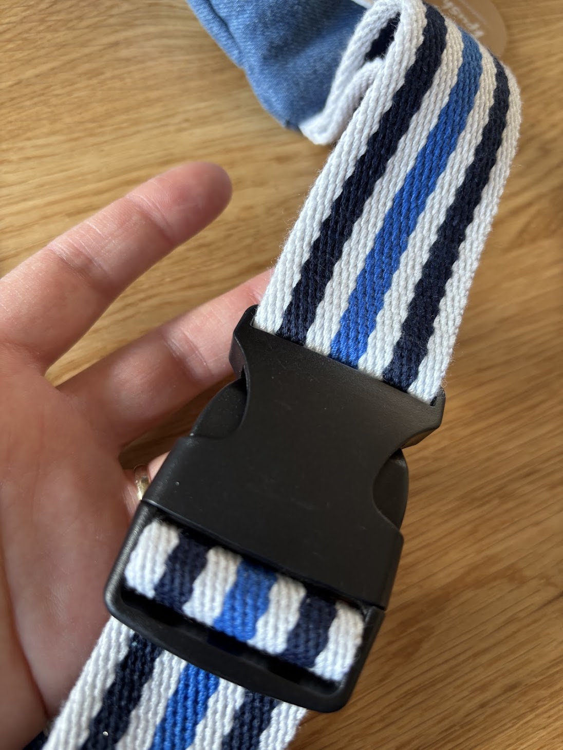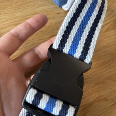 - Sangle ajustable rayée bleu, blanc et marine en coton 100%