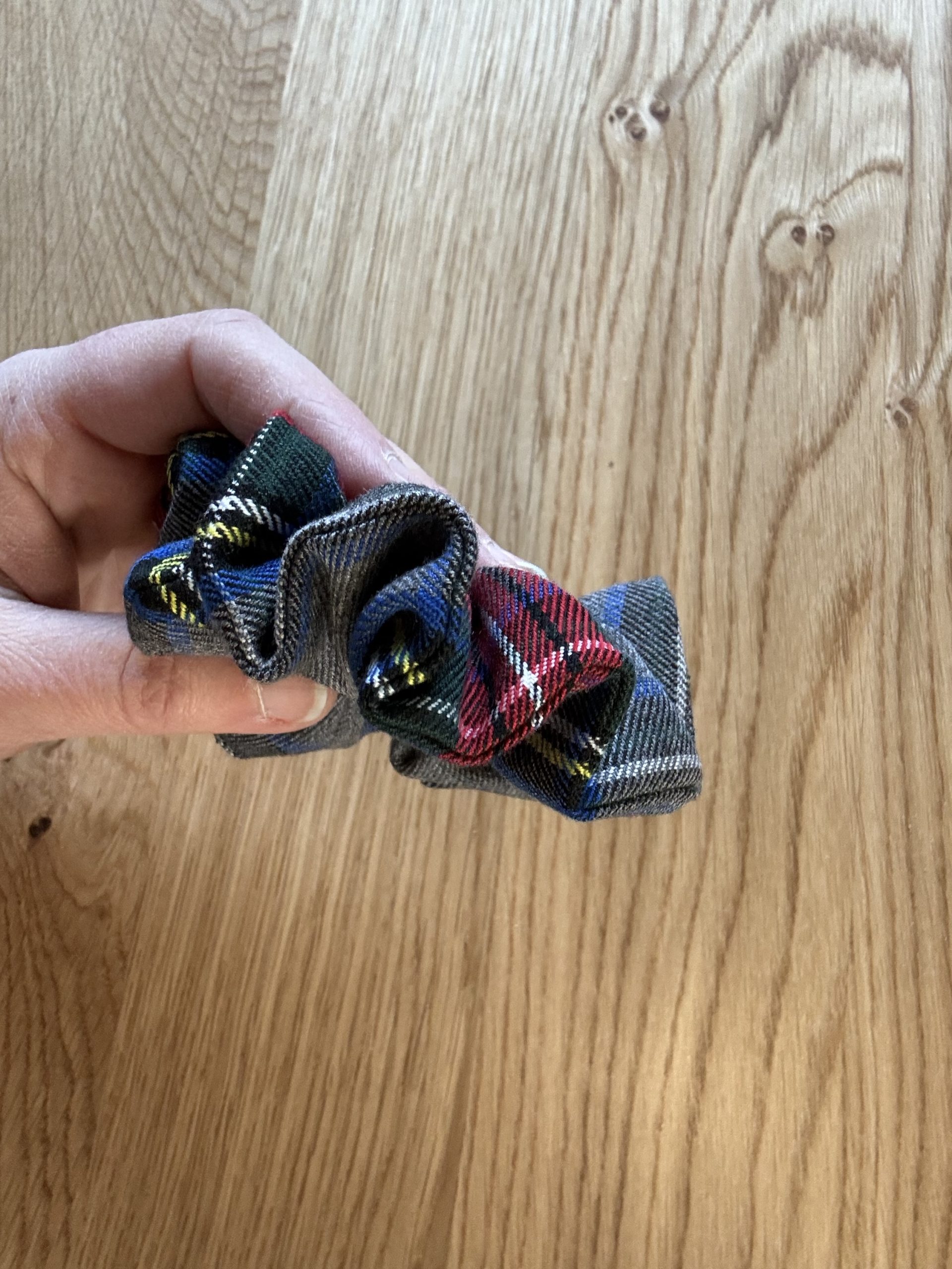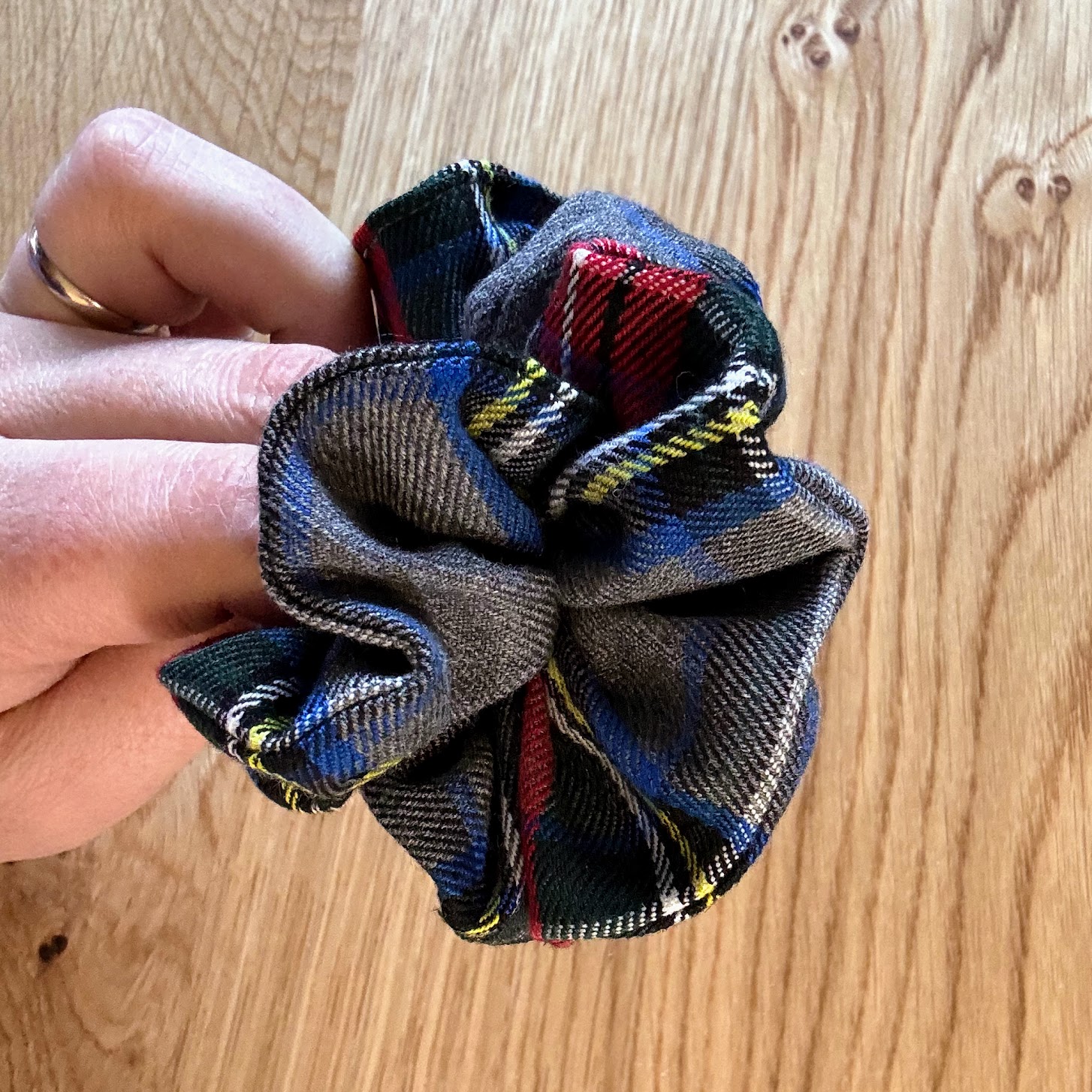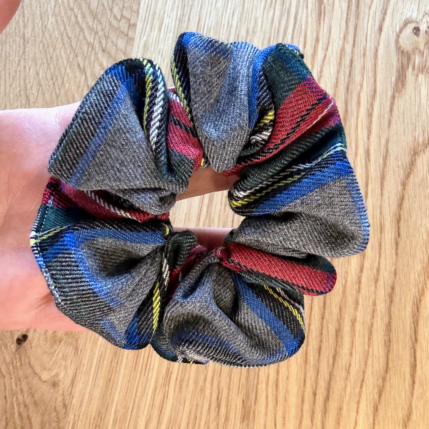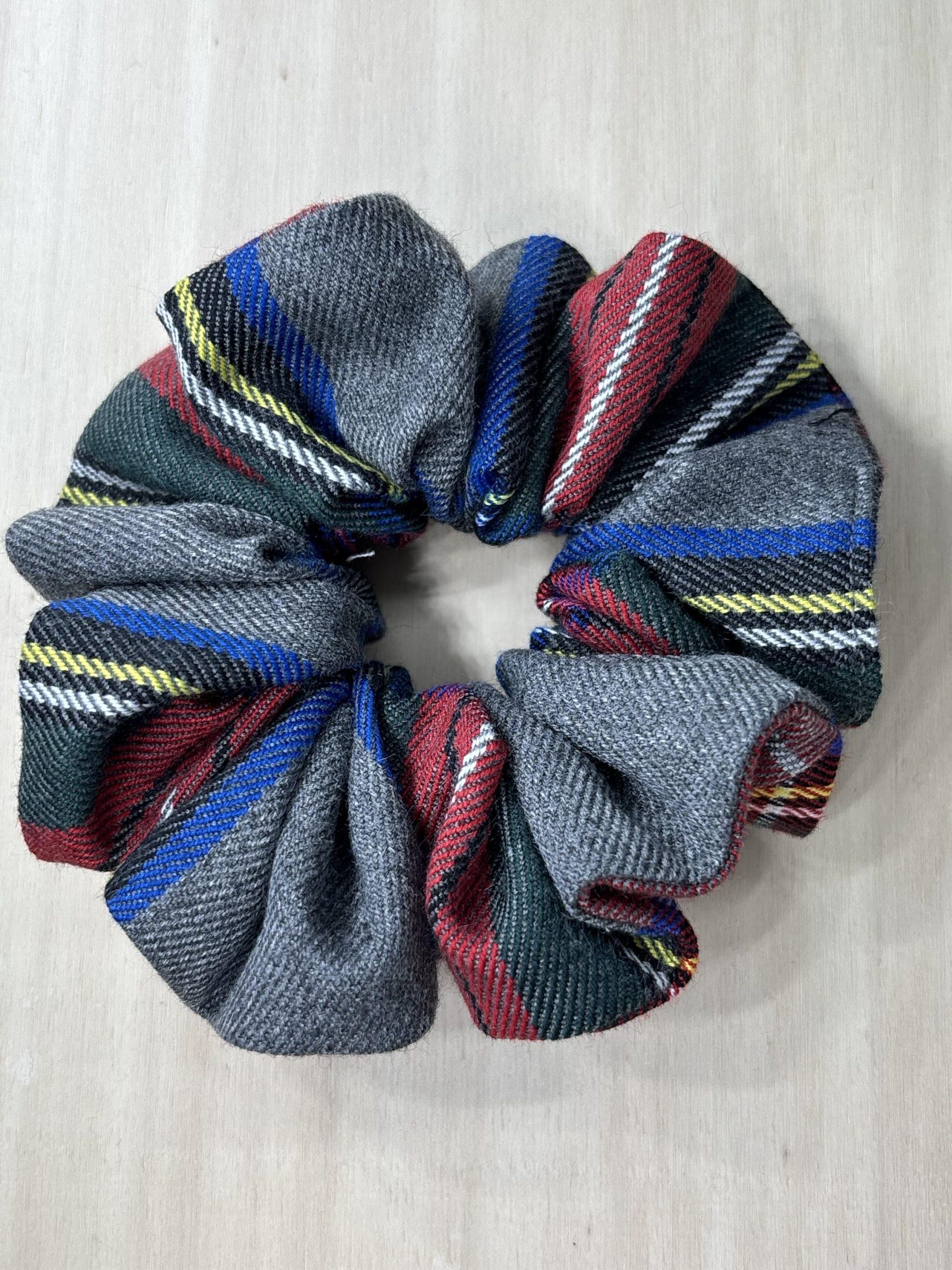 Ce chouchou en tissu écossais dans des nuances de gris, bleu, rouge et vert profond allie sobriété et raffinement.