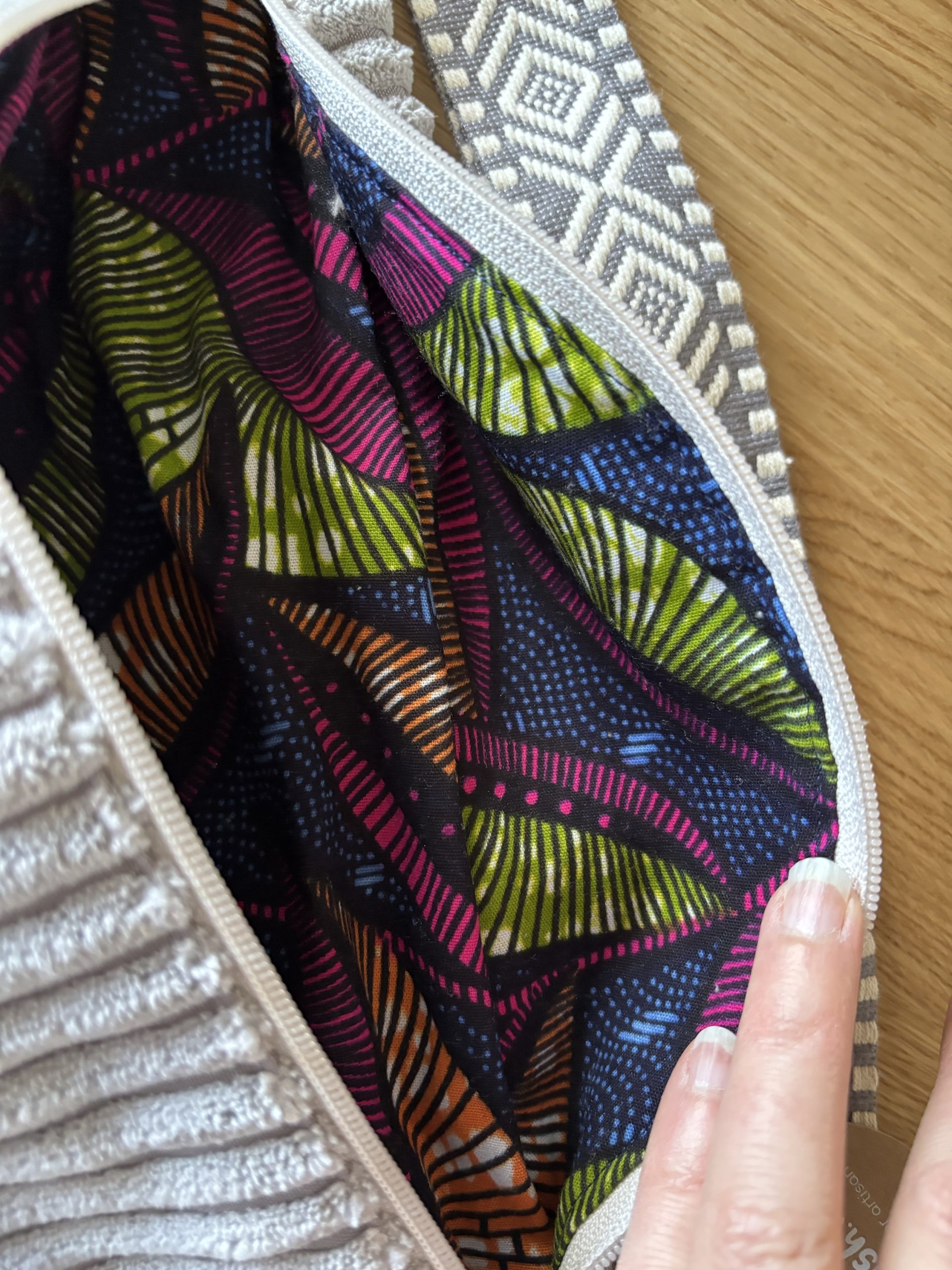 À l’intérieur, surprise ✨ : une doublure en wax coloré à motif de feuilles, lumineuse et pleine de vie. Un contraste délicat qui rappelle que, derrière une allure calme et discrète, se cache toujours une touche de fantaisie.
