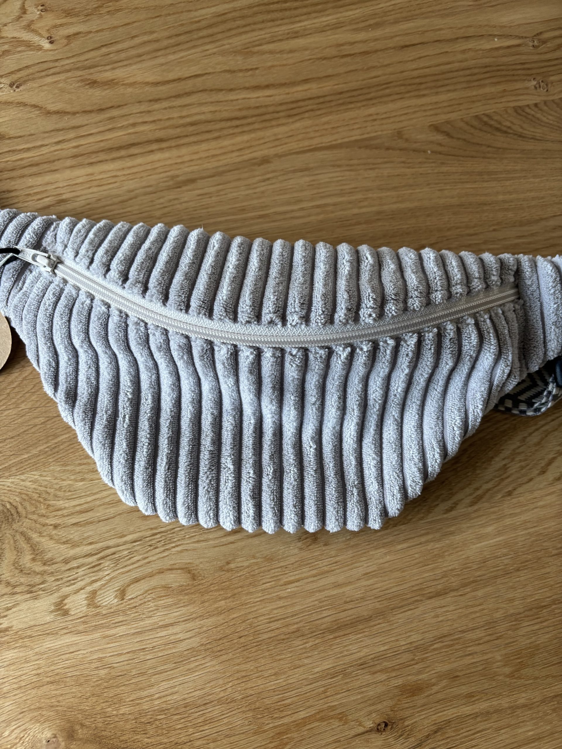 Confectionnée à la main dans un velours gris à grosses côtes, elle offre un toucher doux et enveloppant, tout en affirmant une vraie présence grâce à sa texture généreuse.