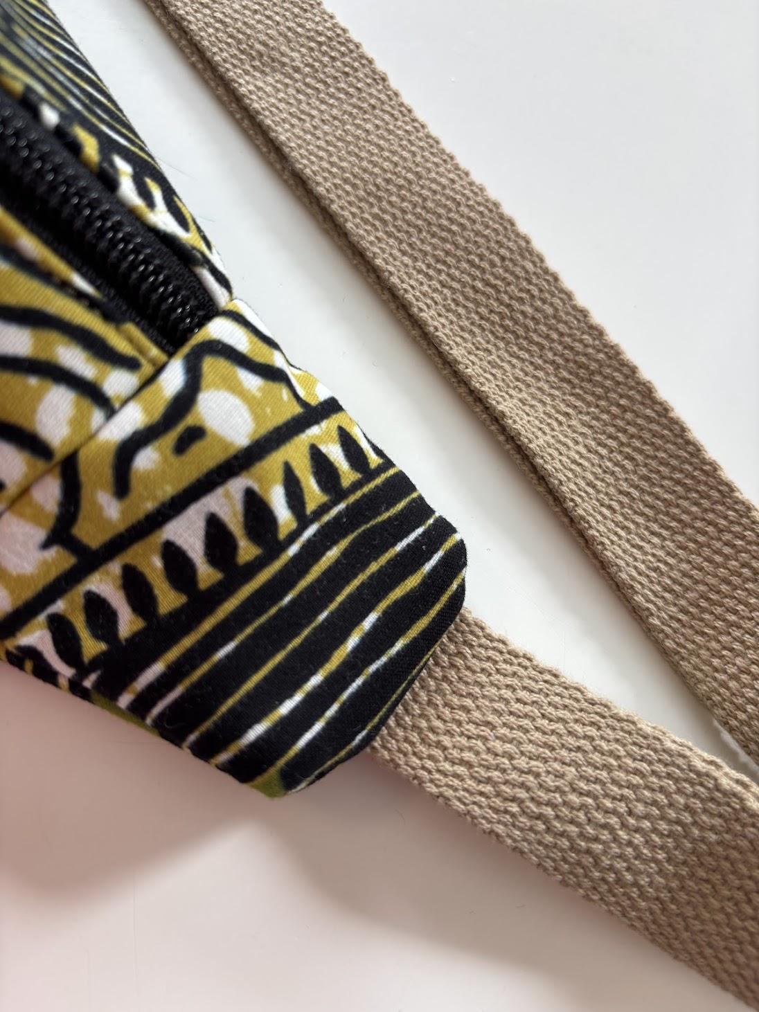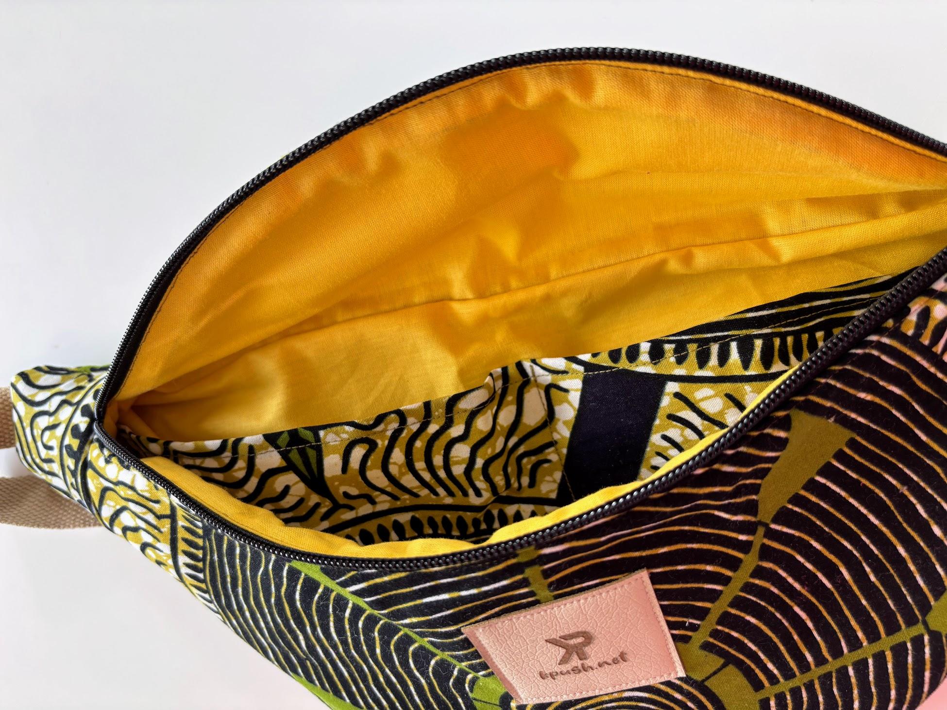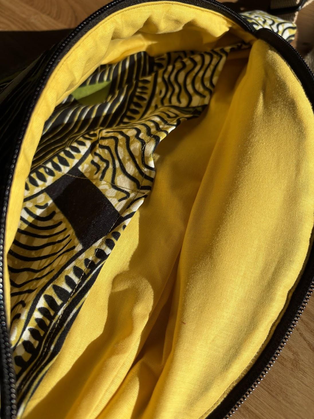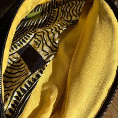 Son format XL permet d’emporter facilement tout le nécessaire du quotidien, sans devoir choisir entre le pratique et le joli. À l’intérieur, le wax continue sur les poches plaquées: parce qu’ici, même les détails qu’on ne voit pas tout de suite comptent. La doublure est en jaune vif.