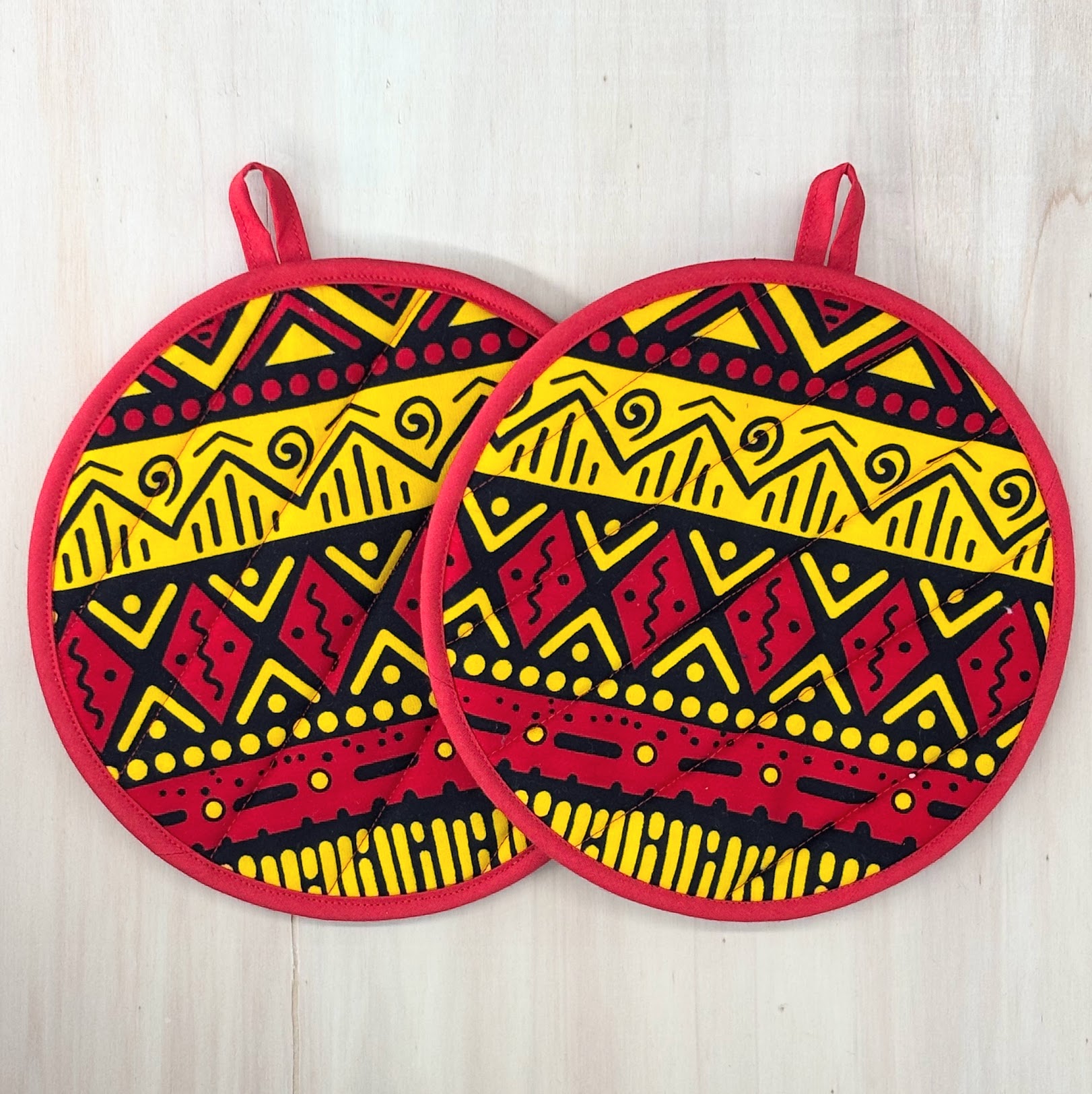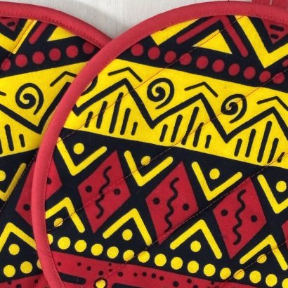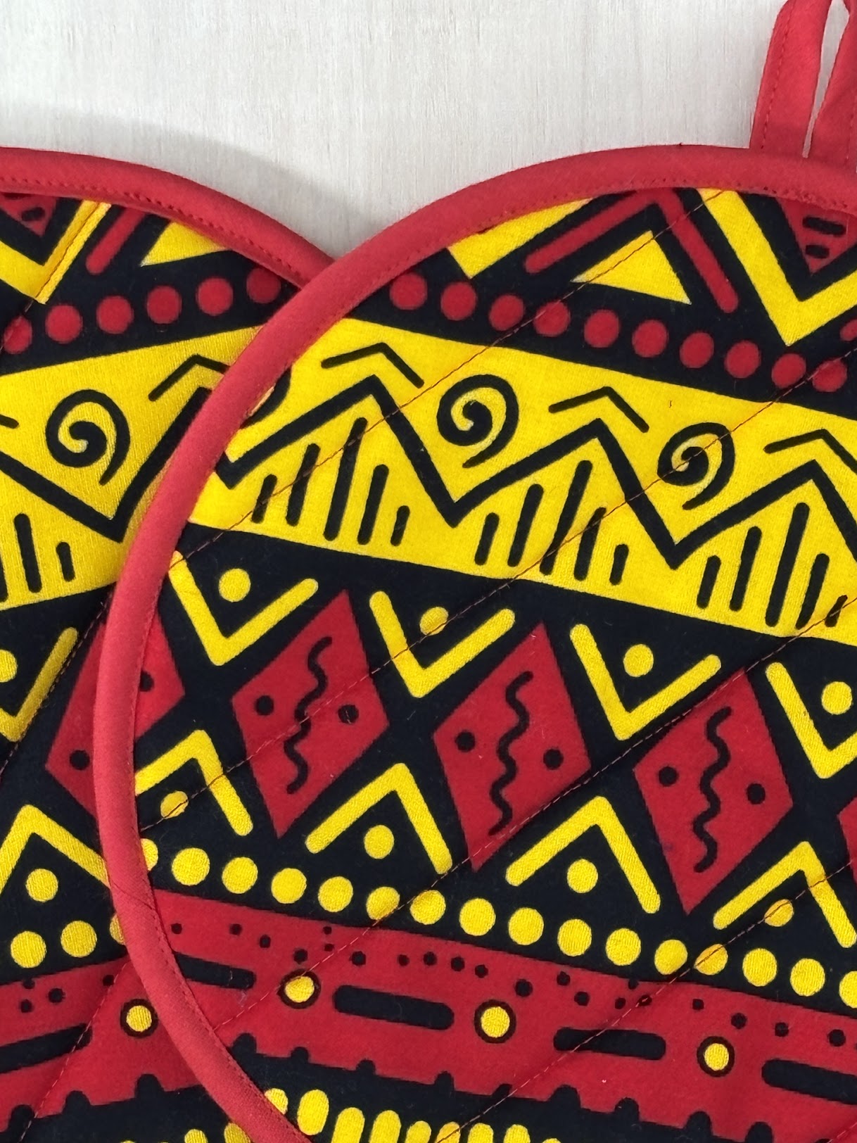 Le tissu Wax, soigneusement sélectionné, mêle rouge profond et jaune éclatant pour un rendu à la fois chaleureux et pétillant (tissus wax sur les deux faces des maniques).