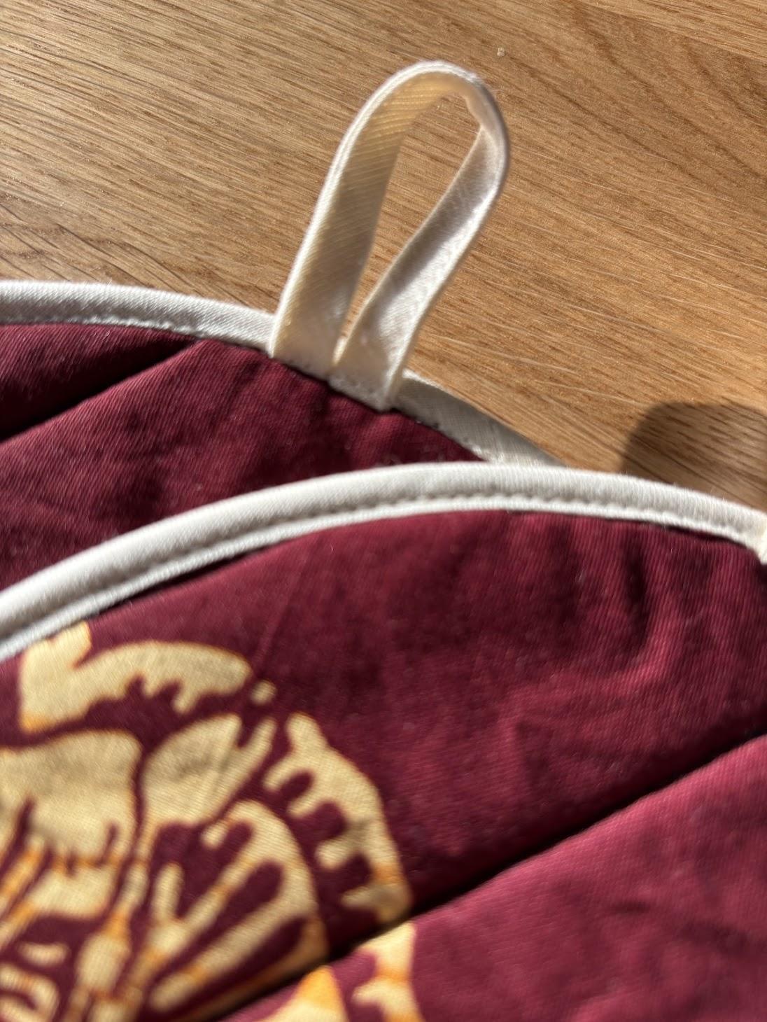 Entièrement matelassées pour une bonne isolation thermique, elles peuvent être utilisées comme maniques ou comme sous-plats, selon vos besoins. Leur format rond et leur petit lien permettent aussi de les suspendre facilement dans la cuisine.