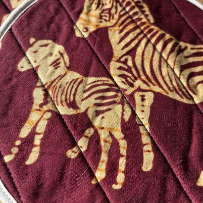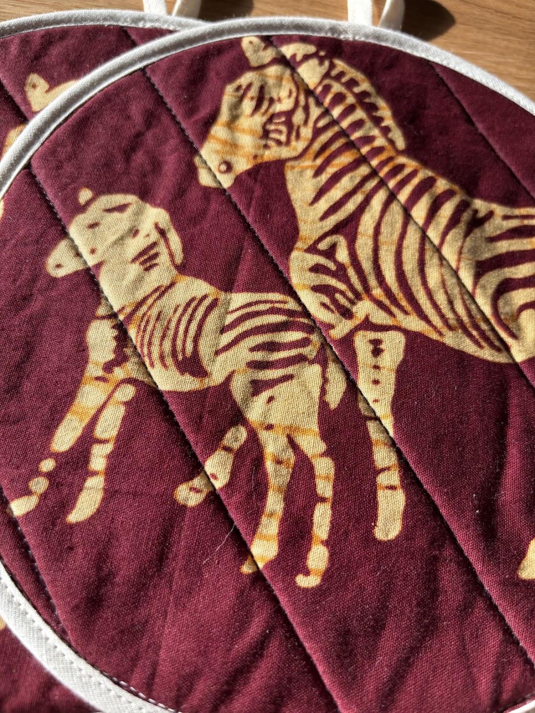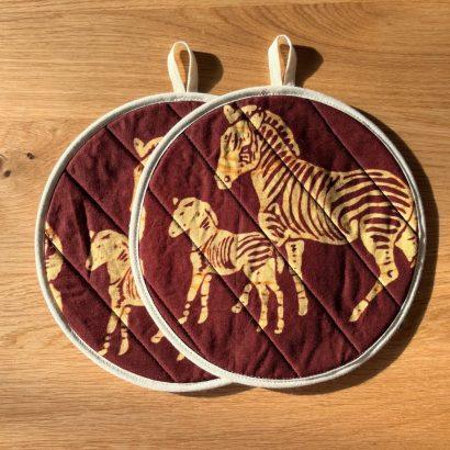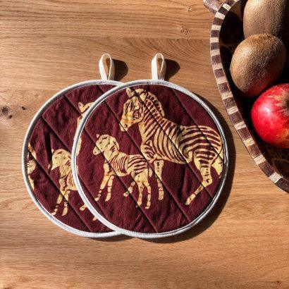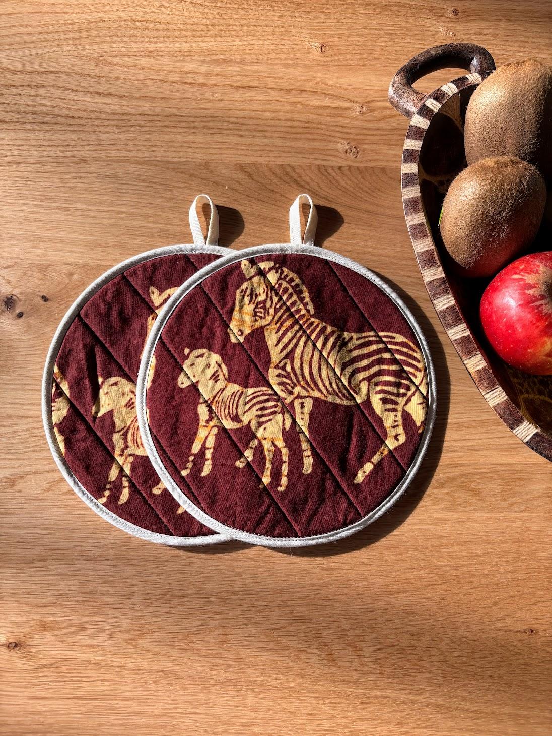 Apportez une touche graphique et chaleureuse à votre cuisine avec cette paire de maniques rondes en tissu wax motif zèbres. À la fois pratiques et décoratives, elles protègent efficacement vos mains et vos surfaces des plats chauds.