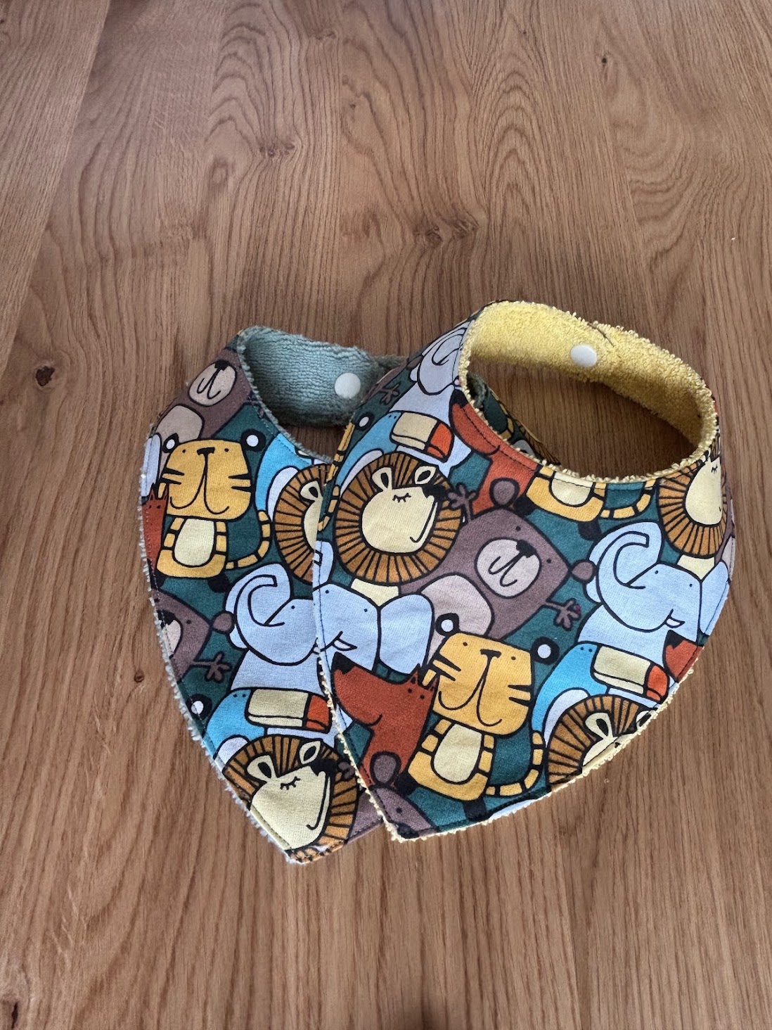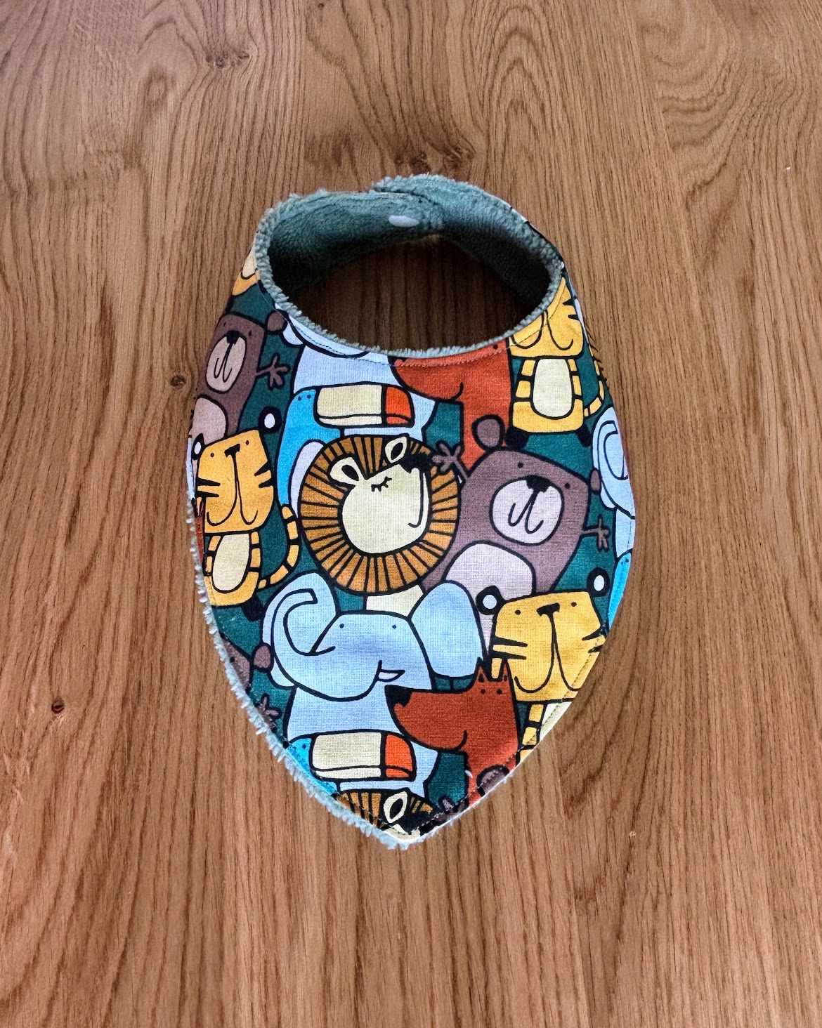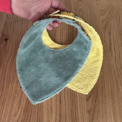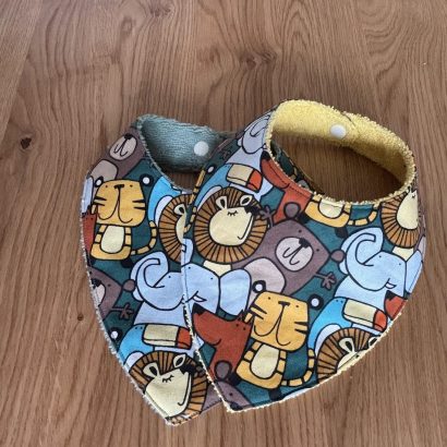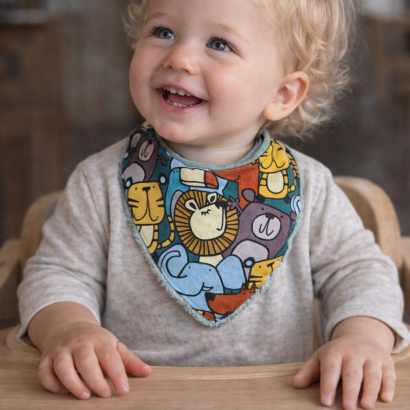 Chaque bandana est fait main, avec soin, et associe un tissu imprimé ludique à une doublure absorbante, pour s’adapter à tous les moments de la journée.