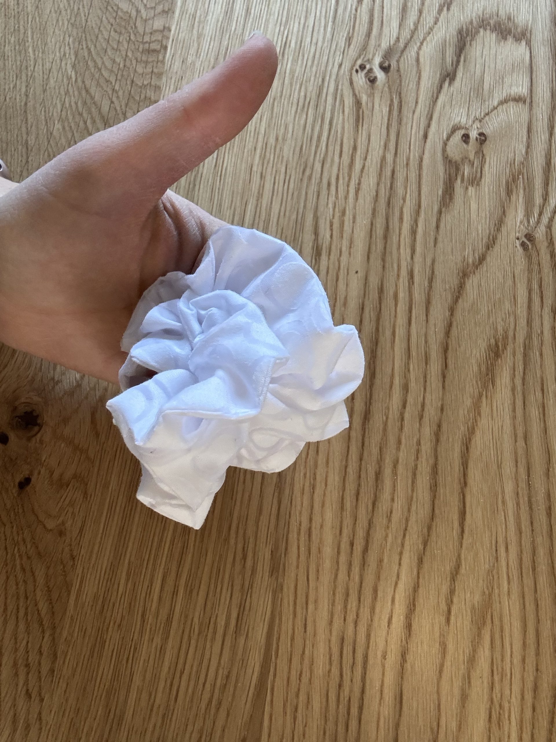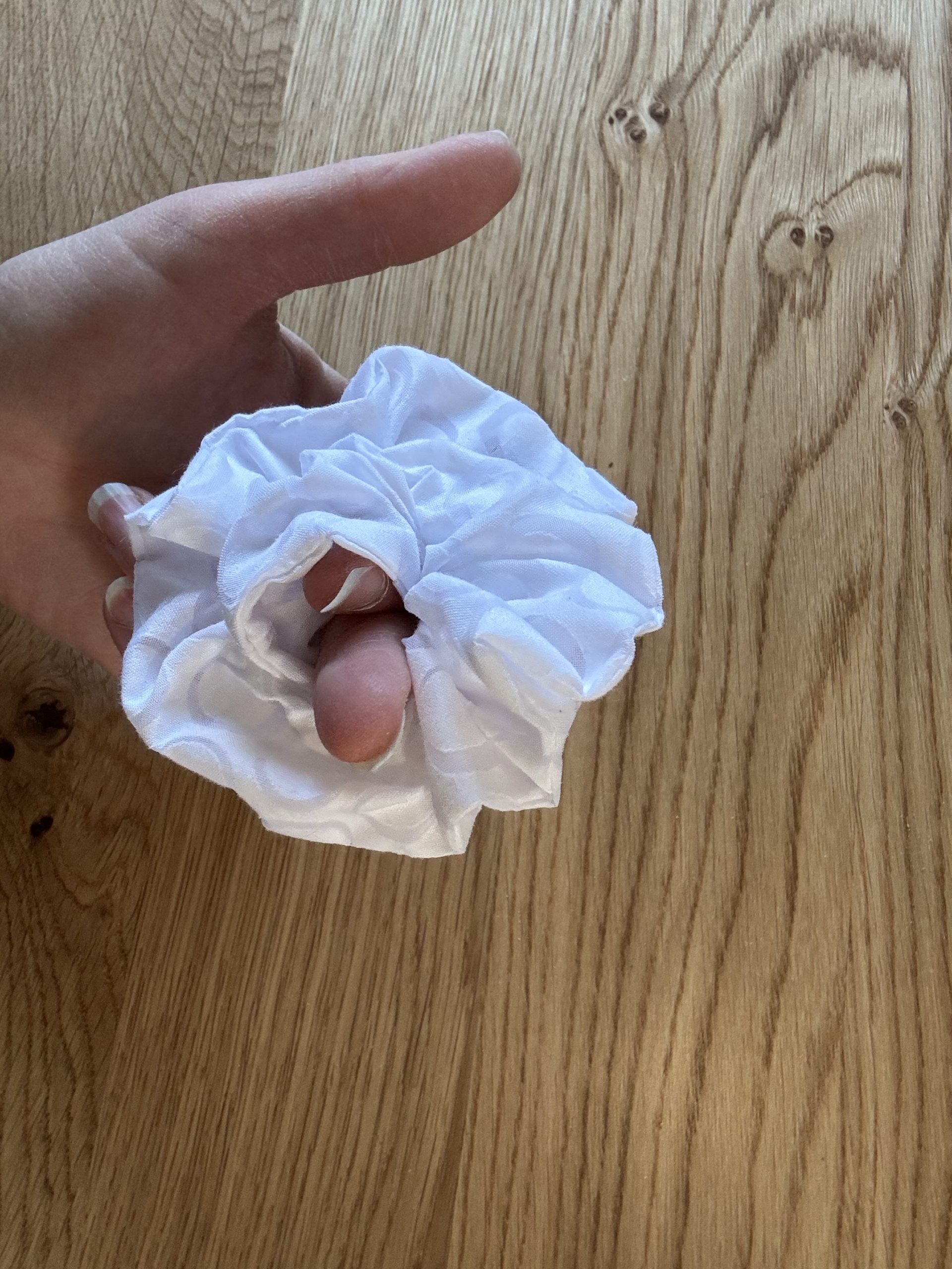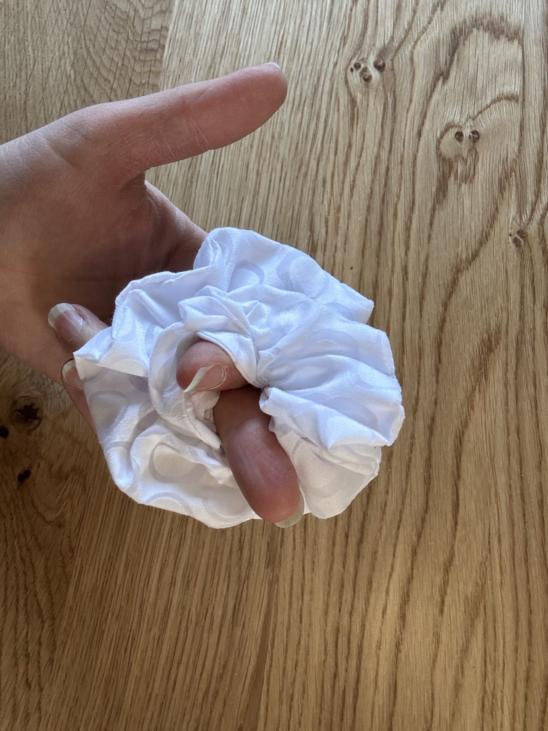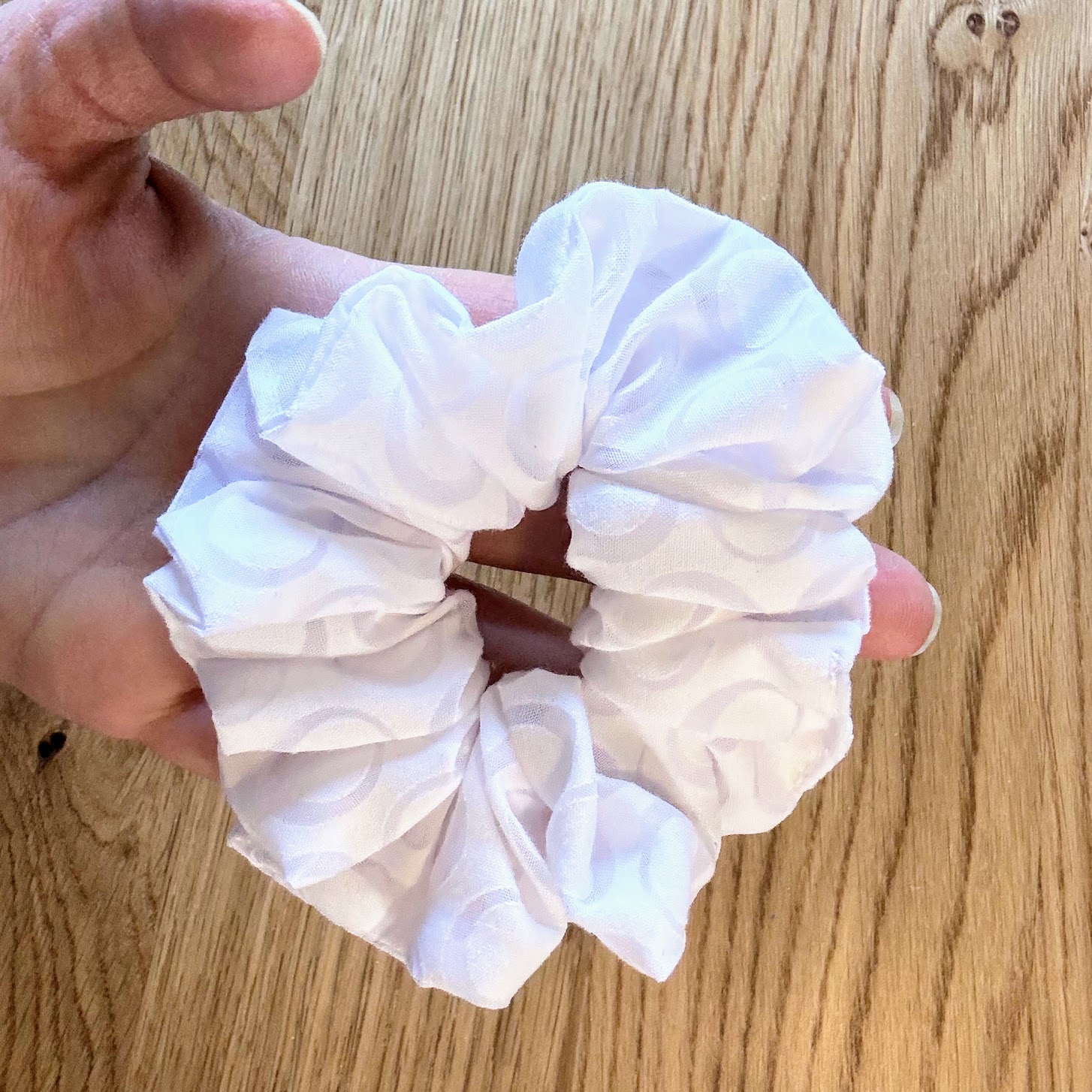Ce chouchou blanc en tissu transparent se distingue par ses subtils motifs de ronds ton sur ton, qui lui donnent un aspect aérien et élégant. Sa matière légère capte la lumière et apporte une touche douce et raffinée à toutes les coiffures.