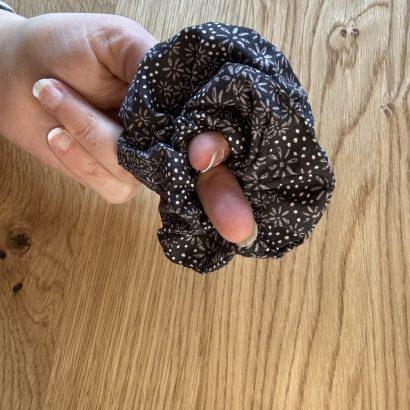 Ce chouchou est confectionné dans un tissu noir orné de petites fleurs grises et blanches, à la fois fins et délicats. Son imprimé discret apporte du caractère tout en restant facile à assortir, pour une coiffure élégante au quotidien.