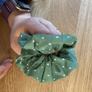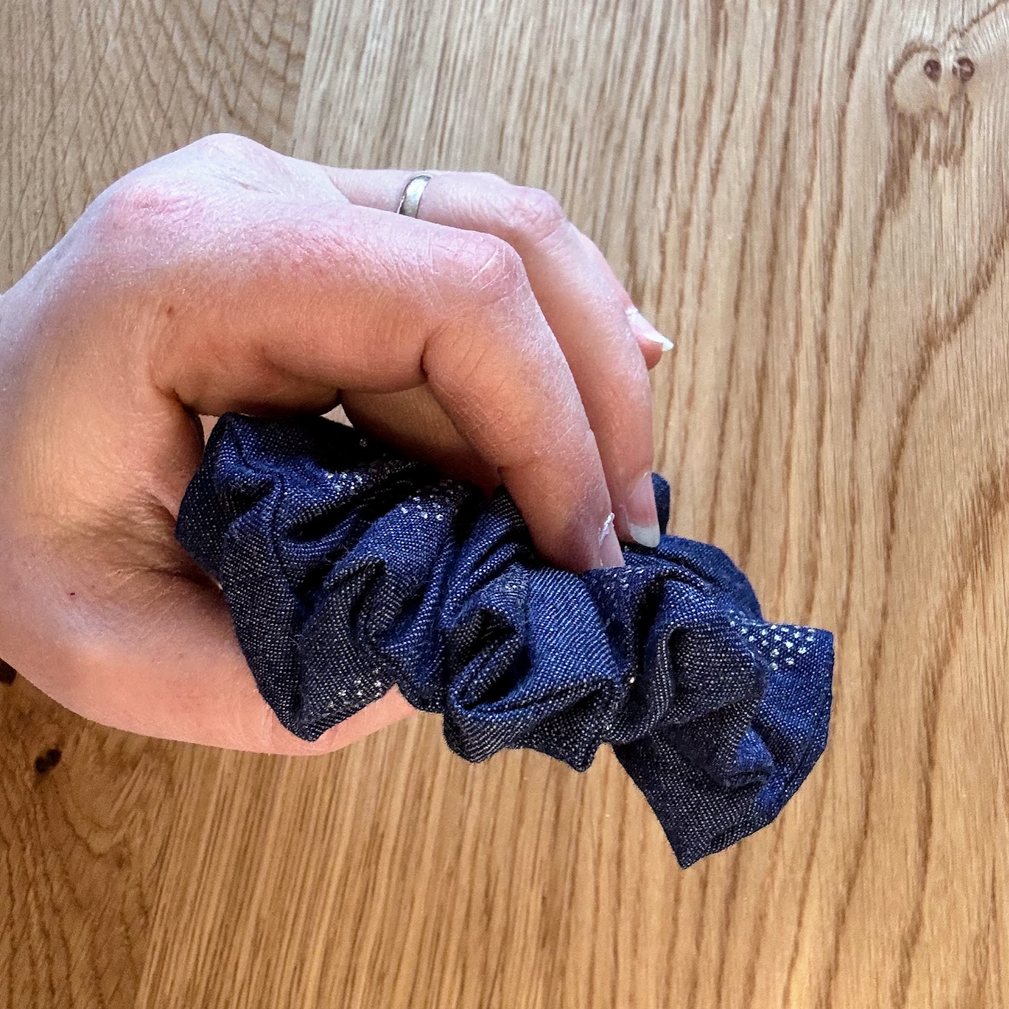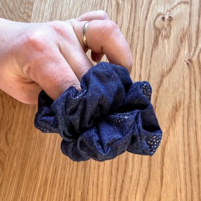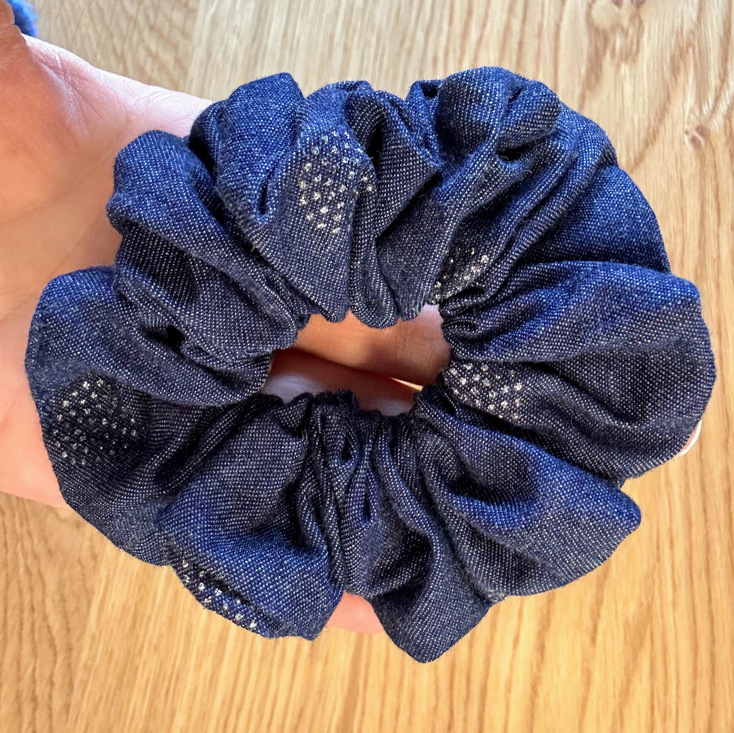 Ce chouchou est confectionné en chambray bleu, subtilement rehaussé de motifs de ronds en paillettes argentées. Le contraste entre la sobriété du tissu et les reflets délicats apporte une touche lumineuse et élégante, parfaite pour sublimer une coiffure sans en faire trop.