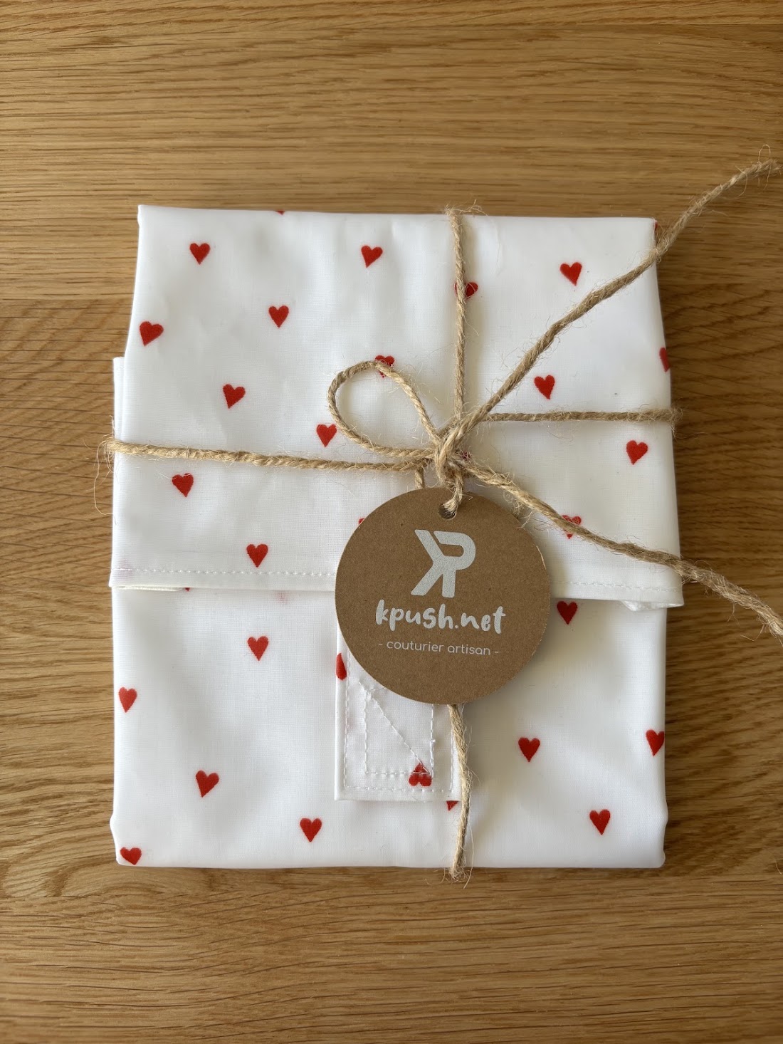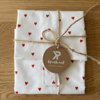 Son tissu enduit orné de petits cœurs rouges protège vos tartines ou votre collation, tandis que sa doublure en PUL garde le tout bien moelleux.