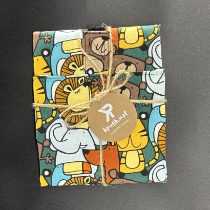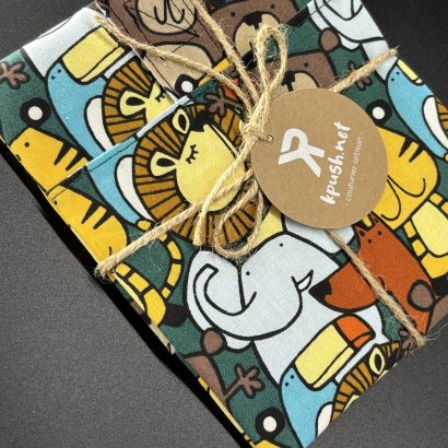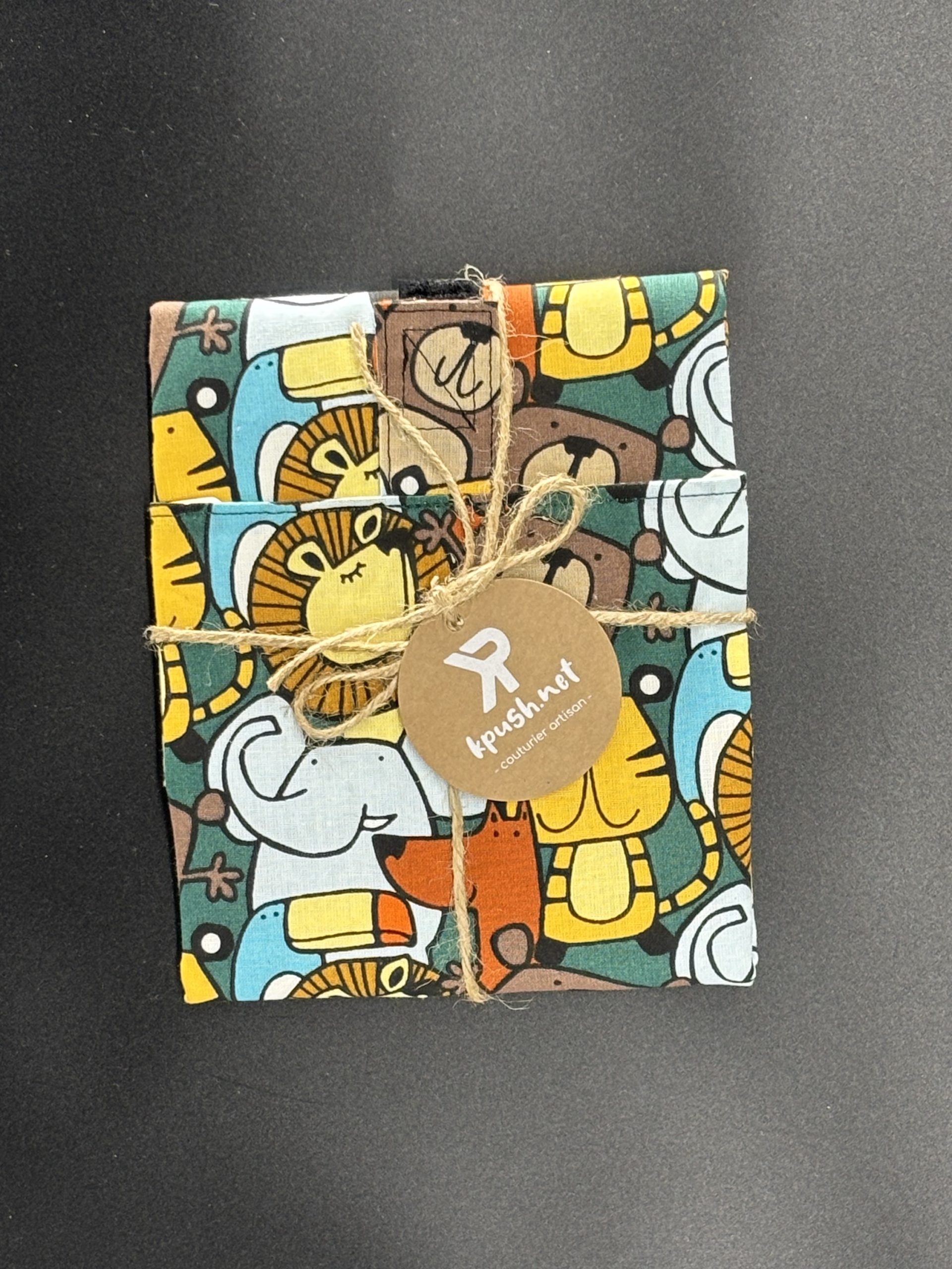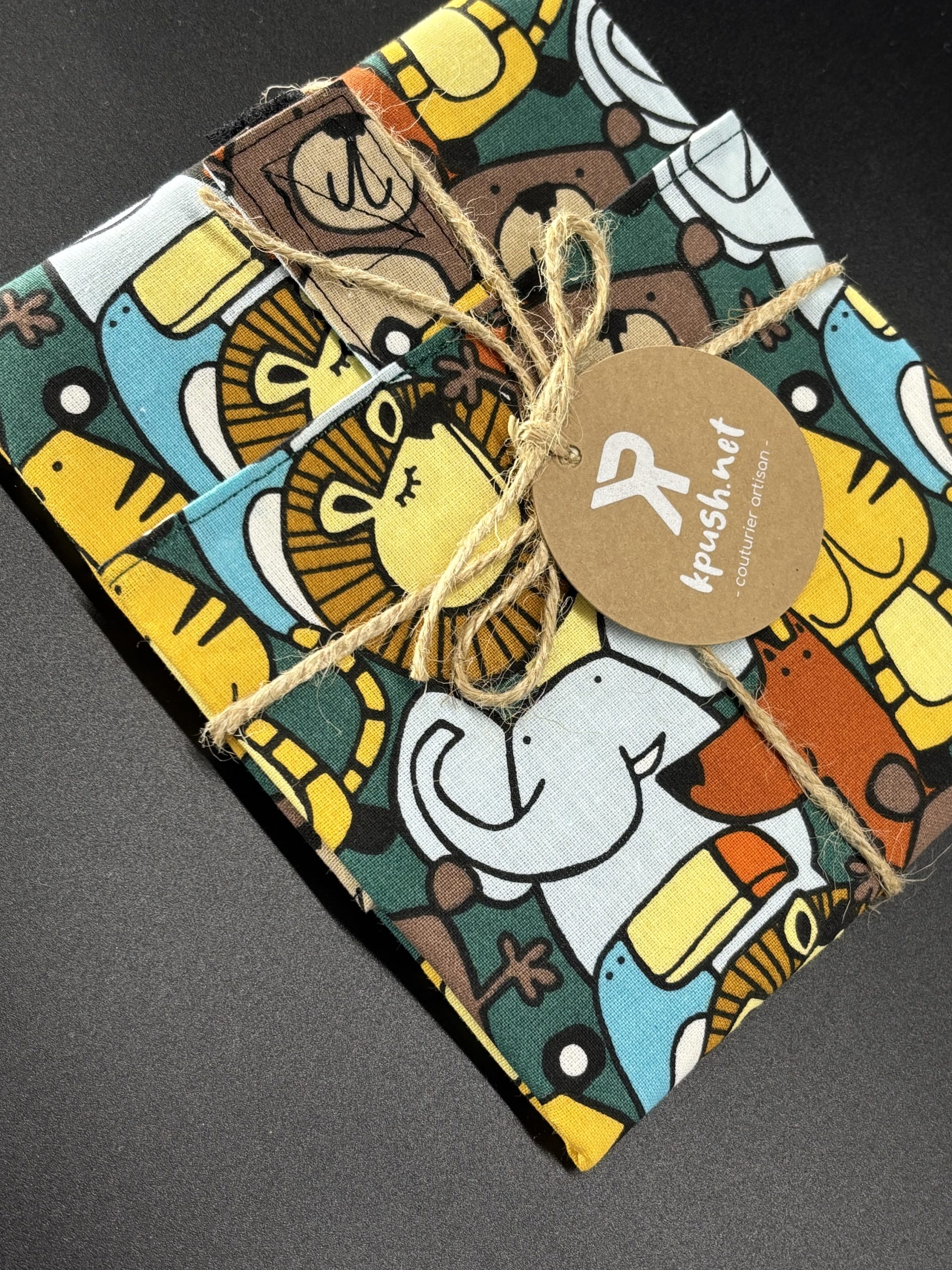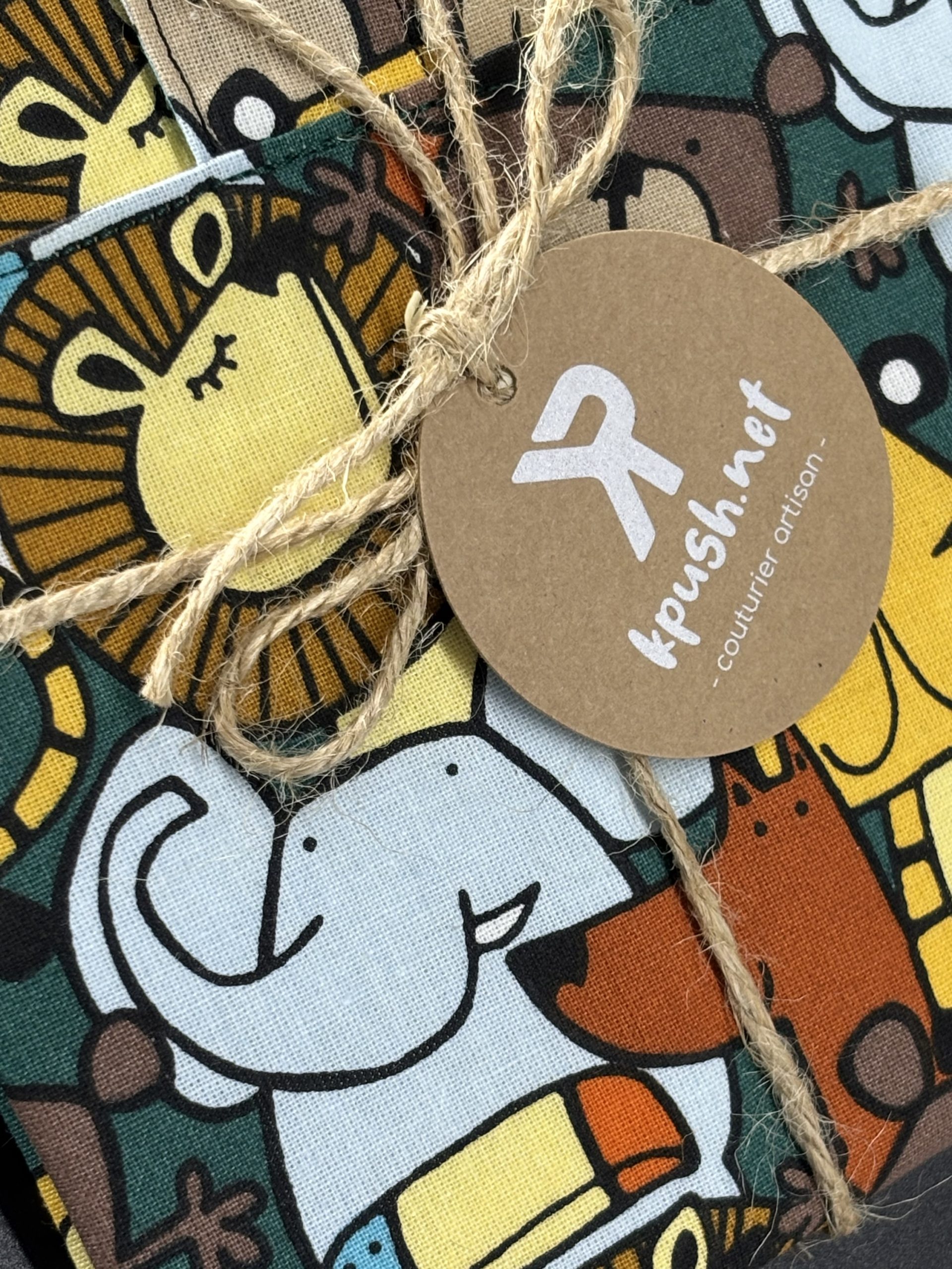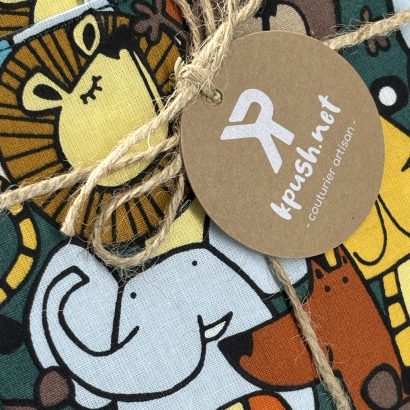 Confectionné à la main dans notre atelier à Bruxelles, il est réalisé dans un tissu aux motifs d’animaux rigolos qui fera sourire les petits gourmands.