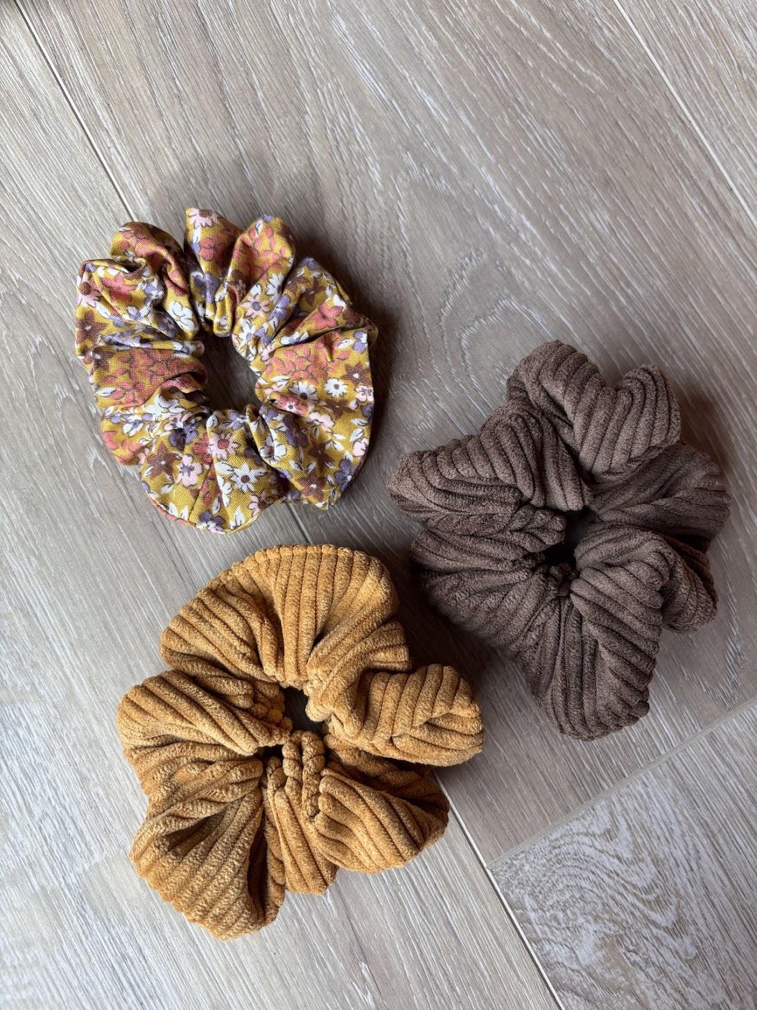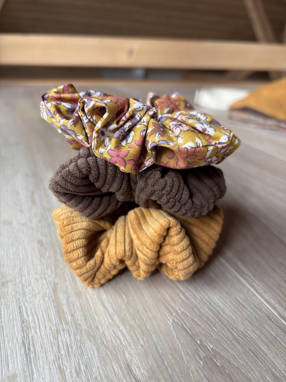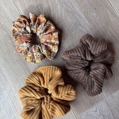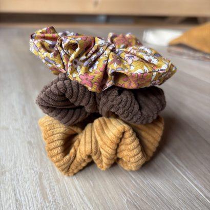 Ce trio se compose de deux chouchous en velours (brun et moutarde) et d’un chouchou en tissu fleuri assorti.